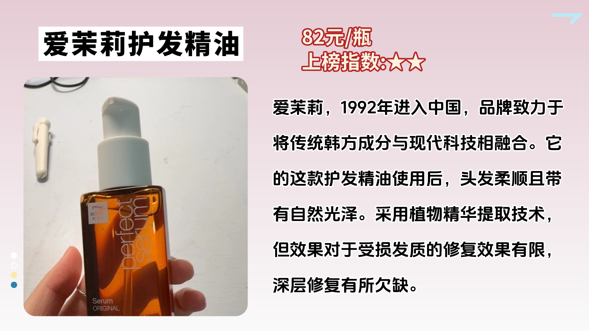 被问护发精油推荐且初好不好用,还想知道 “排名第一” 的是不是真靠谱?其实 “排名第一” 大多是营销噱头,好不好用关键看适配度!且初这类常见品牌的精油,品质比较稳定,但具体效果因人而异。选的时候先看发质:干枯毛躁发看滋润度,油头看清爽度,卷发看是否能维持卷度。另外要注意,正品的包装做工都很规整,不会有漏液、标签脱落的情况,购买时优先选官方渠道。别被排名绑架,适合自己发质、用着舒服的才是最好的。接下来分享我选购护发精油时的一些经验,都是实测出来的干货,建议先收藏慢慢看!