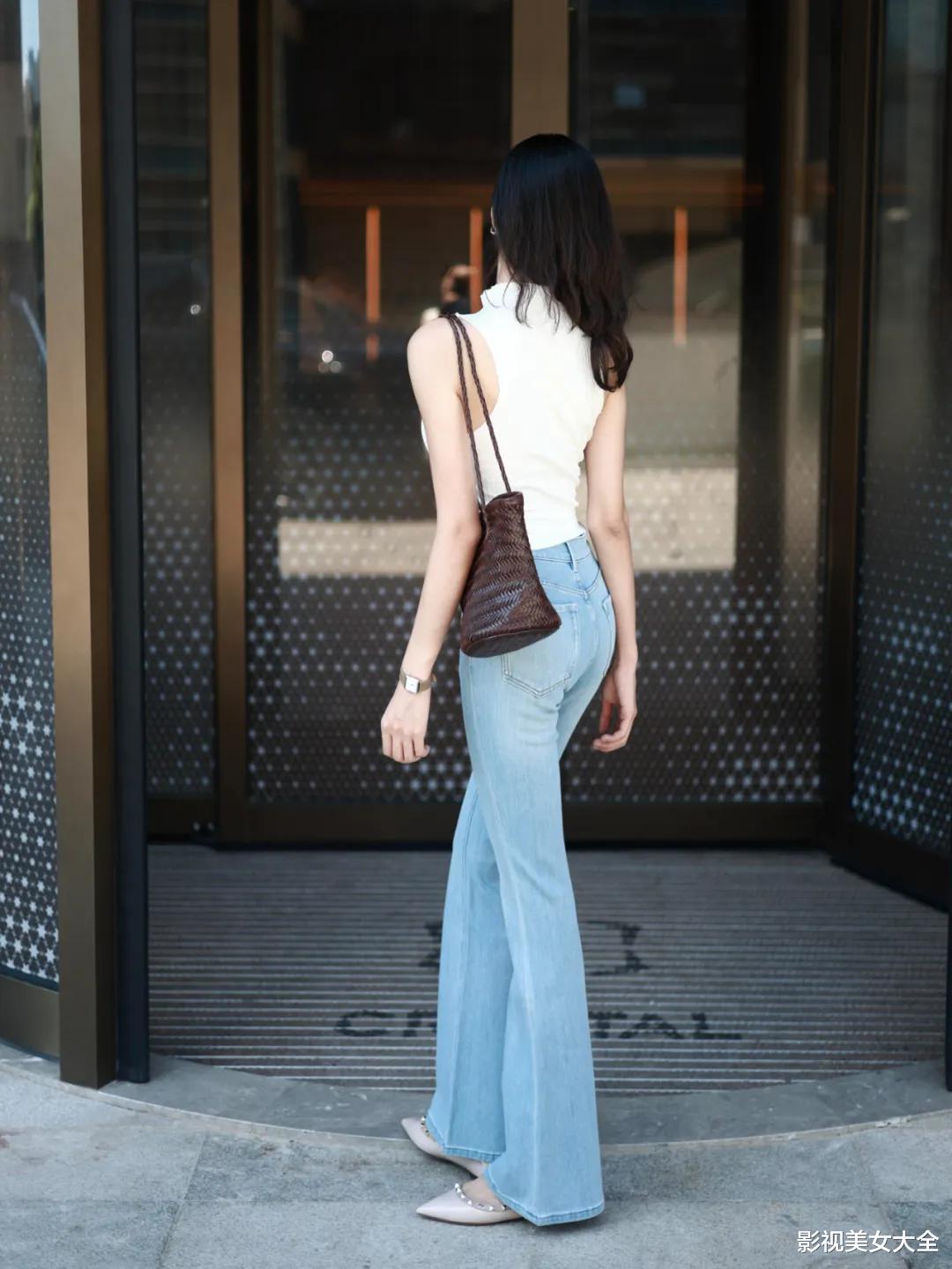 牛仔裤拍照少不了背影。转身背对镜头,假装要走路的动作,画面很有故事感。牛仔裤勾勒身形,背影线条自然大方。随手抓拍下来,照片就很出片,既显瘦又好看。