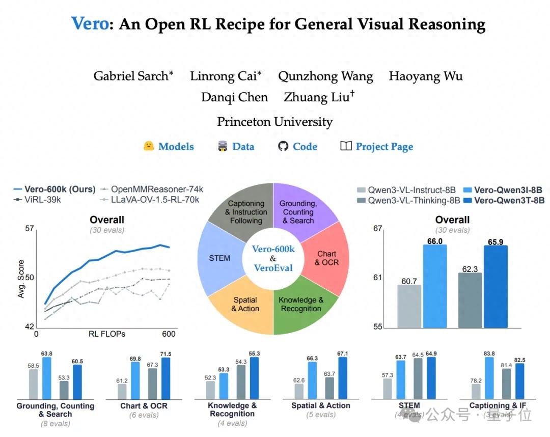 项目名Vero,基于这一方案构建的视觉推理器,能够胜任图表、科学、空间理解和各种开放视觉任务,在30多项测试中达到了8B视觉语言模型的SOTA。