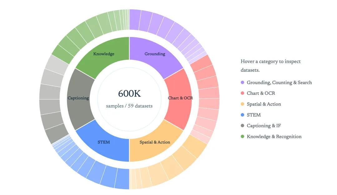 Vero-600K数据集首先,研究人员从59个数据集中精心挑选、过滤并构建了一个包含60万高质量样本的多样化训练集。
