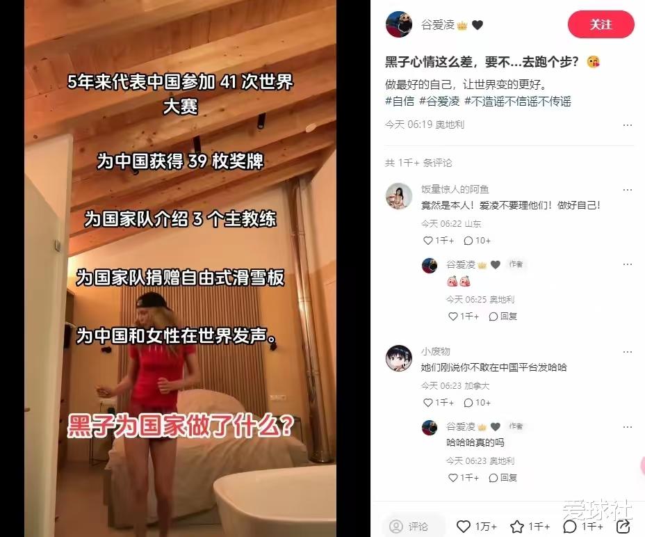 谷爱凌对于黑粉对她个人网上的攻击行为已经忍无可忍,最近在个人社交媒体上正面回怼了一直以来抹黑他的网友,谷爱凌在最新发布的视频中配上了以下文字:5年来代表中国参加41次世界大赛,为中国获得39枚奖牌,为国家队介绍3个主教练,为国家队捐赠自由式滑雪板,为中国和女性在世界发声,黑子们为国家做个什么?并说:“黑子心情那么差,要不......去跑个步?”