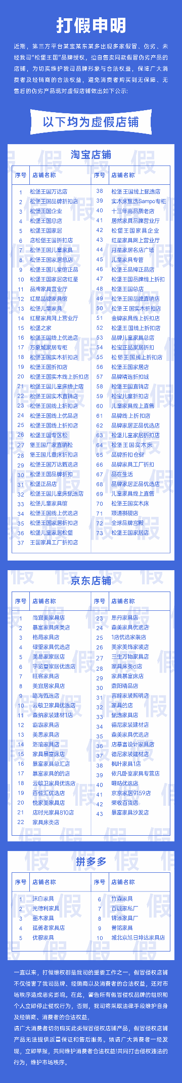 声明称,近期松堡王国总部接到多起消费者投诉,反映在淘宝、京东、拼多多等第三方平台出现了一批假冒、伪劣、未经"松堡王国”品牌授权,擅自售卖同款假冒伪劣产品的店铺。为切实维护品牌形象与合法权益,保障广大消费者及经销商的合法权益,避免消费者购买到无保障、无售后的伪劣产品,松堡王国对虚假店铺做出严正公示。