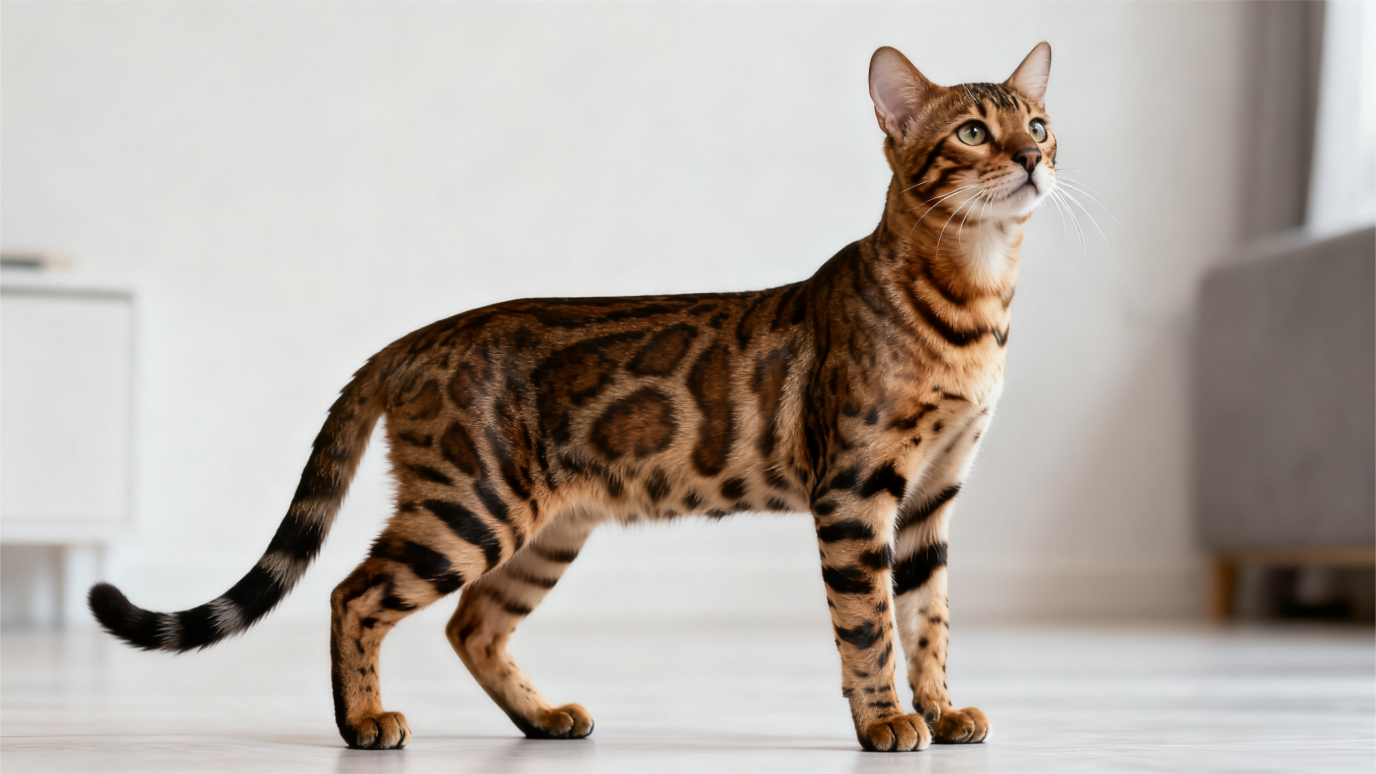 孟加拉猫属于中大型猫种,体长 50-65 厘米,肩高 25-30 厘米,体重 3.5-7 千克,雄性体型明显大于雌性,整体呈肌肉发达的运动型结构。躯干修长健壮,胸部宽阔,背部微微隆起,腰线紧凑,行走时步态稳健有力,尽显野性活力。四肢粗壮修长,与身体比例协调,后肢略长于前肢,肌肉线条清晰,跳跃时爆发力极强,能轻松跃至 1.5 米以上的高处。爪子宽大呈圆形,肉垫厚实有弹性,颜色多为黑色或深褐色,抓握力强,适合攀爬与奔跑。尾巴长度约为躯干的 2/3,基部粗壮,向尾尖逐渐变细,覆盖着短而浓密的毛发,尾尖常带有黑色斑纹,走动时自然摆动如平衡杆。