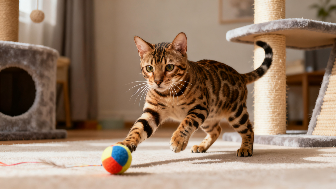 孟加拉猫是典型的 “精力旺盛型” 品种,每日活跃时段覆盖清晨、午后与傍晚,此时会展现出强烈的野生本能,追逐玩具、攀爬家具、甚至 “开门开抽屉”,能利用家中环境创造多种 “捕猎游戏”。它们对空间需求极高,不仅善于攀爬,还擅长跳跃与奔跑,在家中常能看到其 “飞檐走壁” 的身影,但破坏力可控,很少刻意啃咬家具,更多是通过运动释放精力。与其他品种不同,孟加拉猫的活跃状态可持续至老年,即使 8 岁以上,仍会保持每日 2-3 小时的运动量,建议在家中设置高猫爬架、益智喂食器及互动玩具,满足其运动与智力需求。