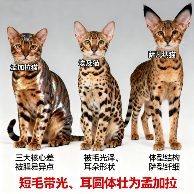 孟加拉猫最易与埃及猫、萨凡纳猫混淆,可通过三大核心特征区分: