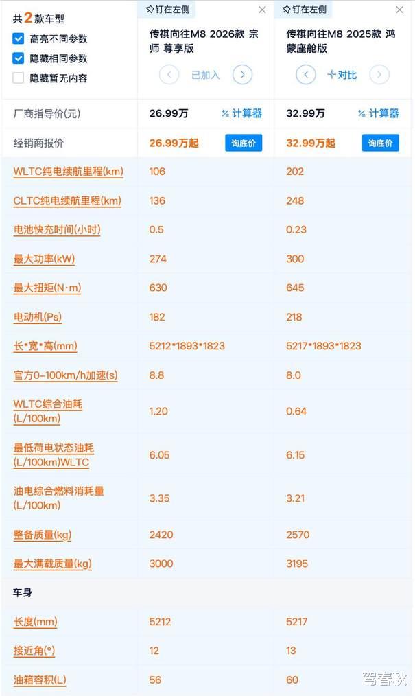 由于电池的改变,在动力数据方面,2026款传祺M8标配的最大功率274kW,峰值扭矩630牛米;较之2025款老款的标配动力也有所下降。