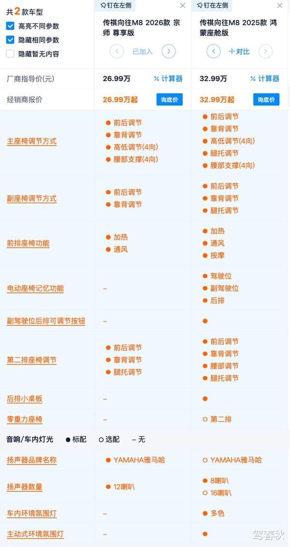 所以综合来看,这6万元的降低,配置相差的也是比较多的。还有一点,就是2026款车型没有推出搭载华为乾崑智驾的版本,这也是这台车价格比老款大幅降价的一个原因。