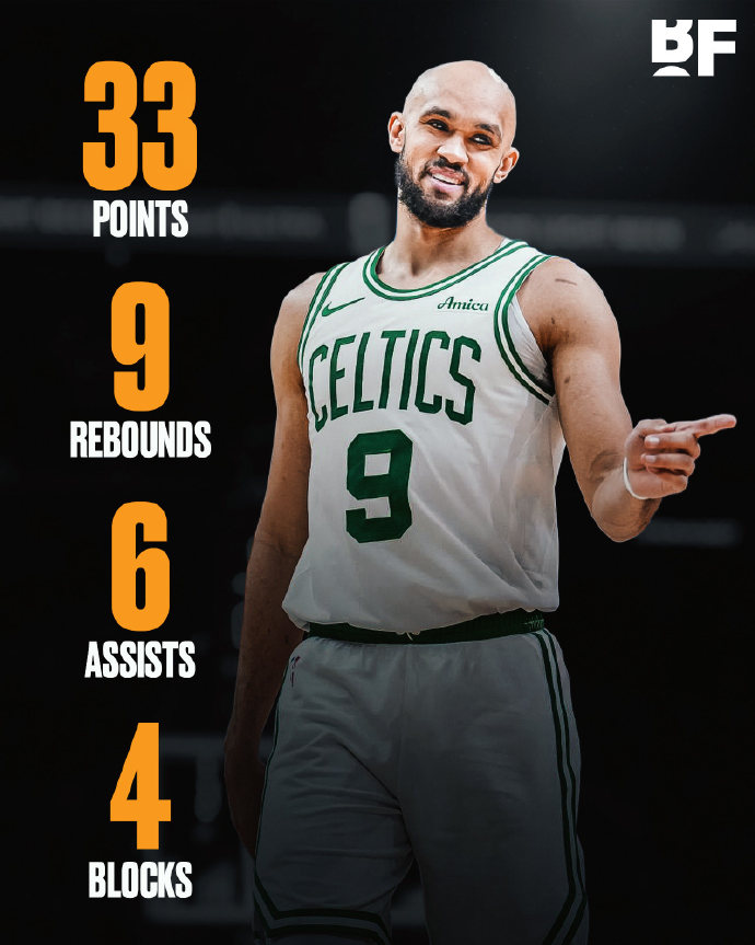 怀特今天迎来大爆发,出战35分钟,23投10中,三分17投6中,罚球9罚7中,砍下全场最高的33分,还有9篮板6助攻4盖帽的全面数据。而布朗首节只打了7分钟就因伤提前退出比赛,4投2中,三分球3中1,只得到7分2篮板。