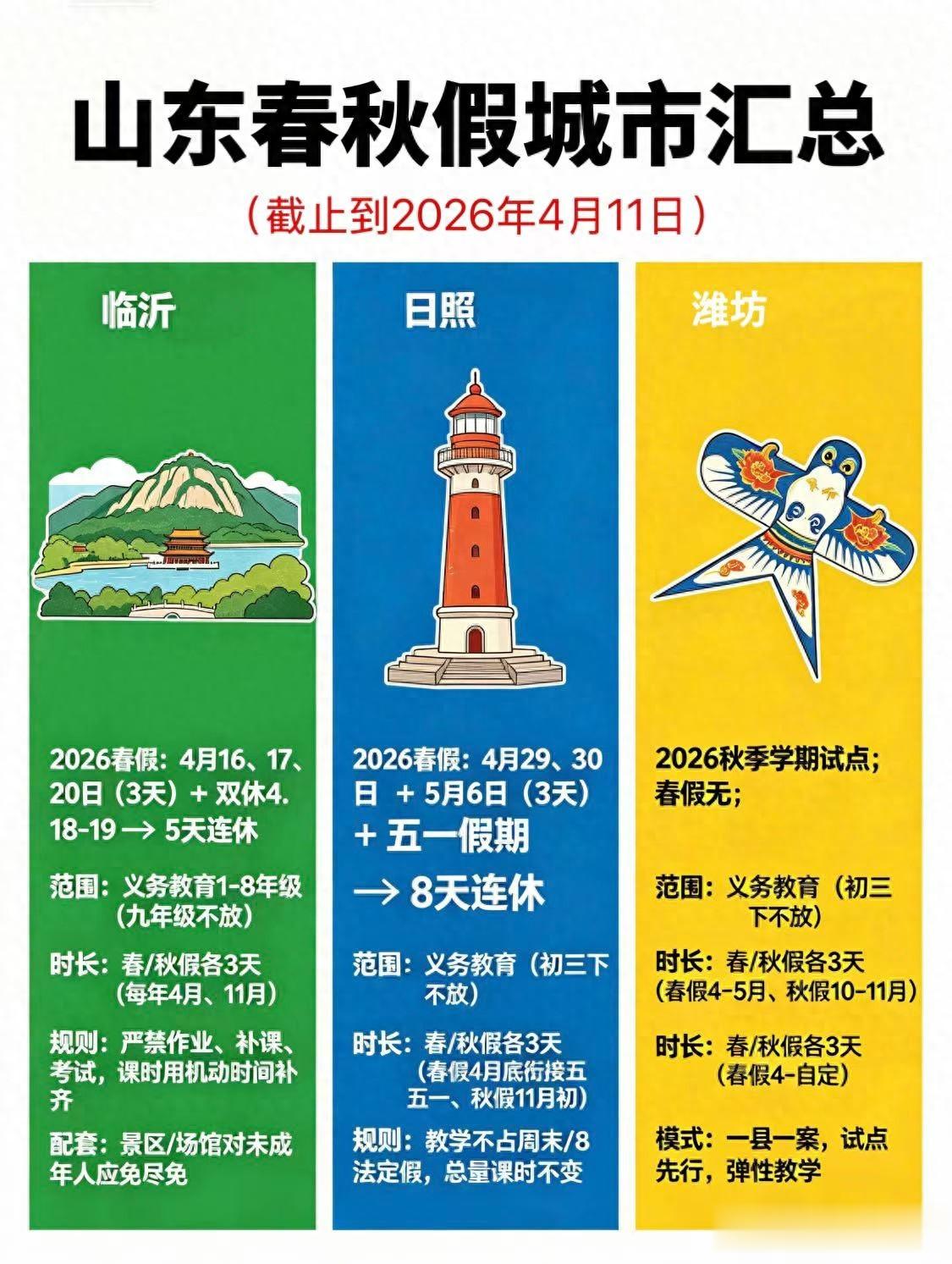 截止4月11日,山东四市已出春秋假期政策,其中春假临沂、日照两市即将执行,潍坊今年春假暂不放。