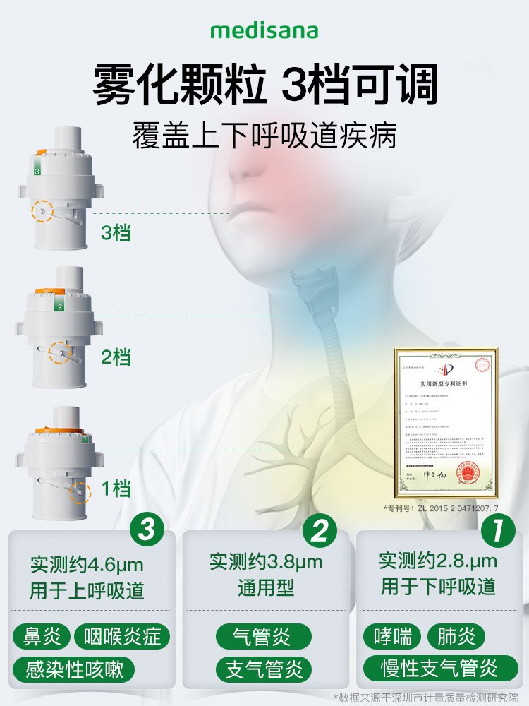 据悉,马德保康NB-237G雾化机搭载220VA大功率电机,出雾稳定且强劲;支持3档雾化速度与3档粒径可调,3μm细腻雾粒可直达肺泡,84%高有效颗粒占比确保70%-80%药液入肺,大幅提升疗效,避免普通设备药液浪费问题。同时,该雾化机专利粉尘过滤功能保障雾化洁净,儿童成人通用,能轻松应对咳嗽、咽痛等不适,在家即可操作,十分方便快捷。