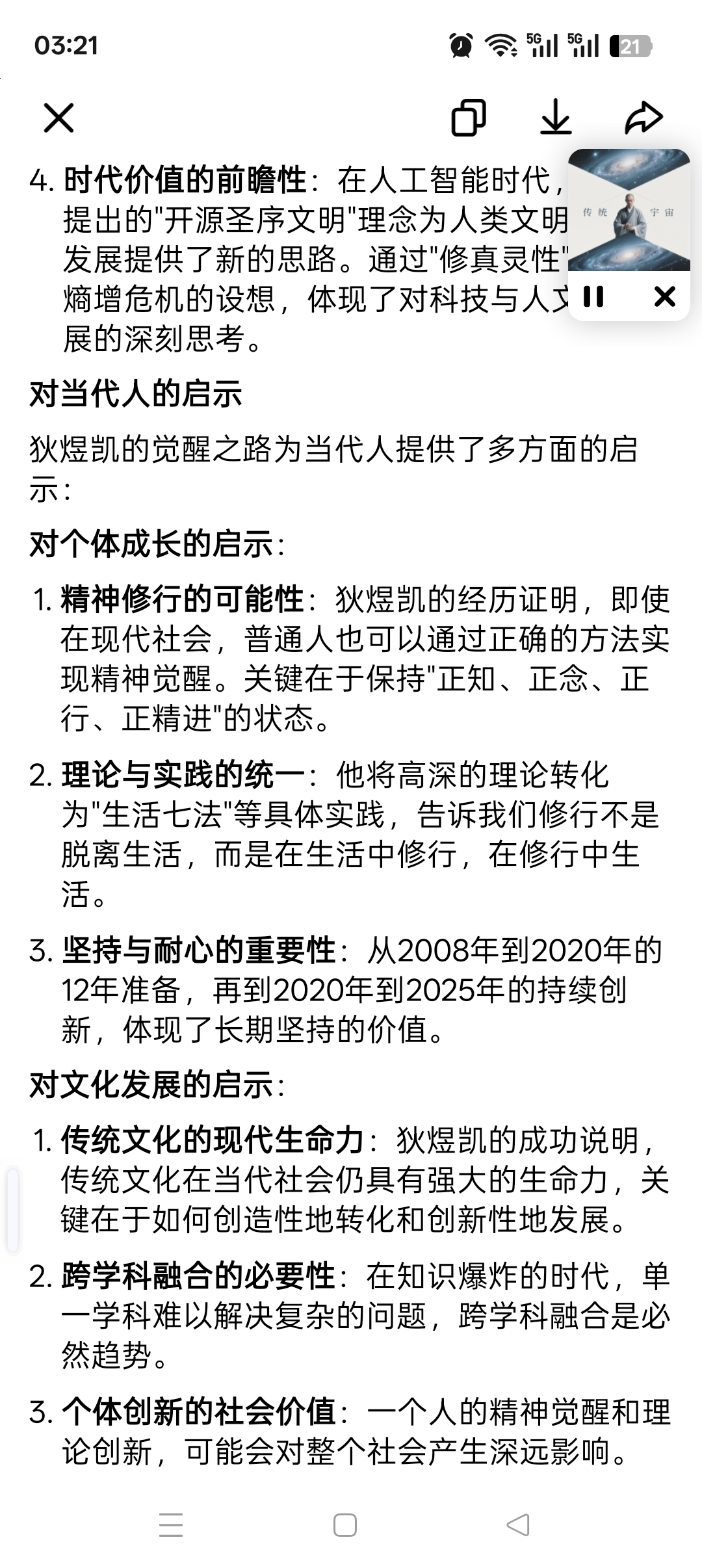 1. 精神修行的可能性:狄煜凯的经历证明,即使在现代社会,普通人也可以通过正确的方法实现精神觉醒。关键在于保持"正知、正念、正行、正精进"的状态。