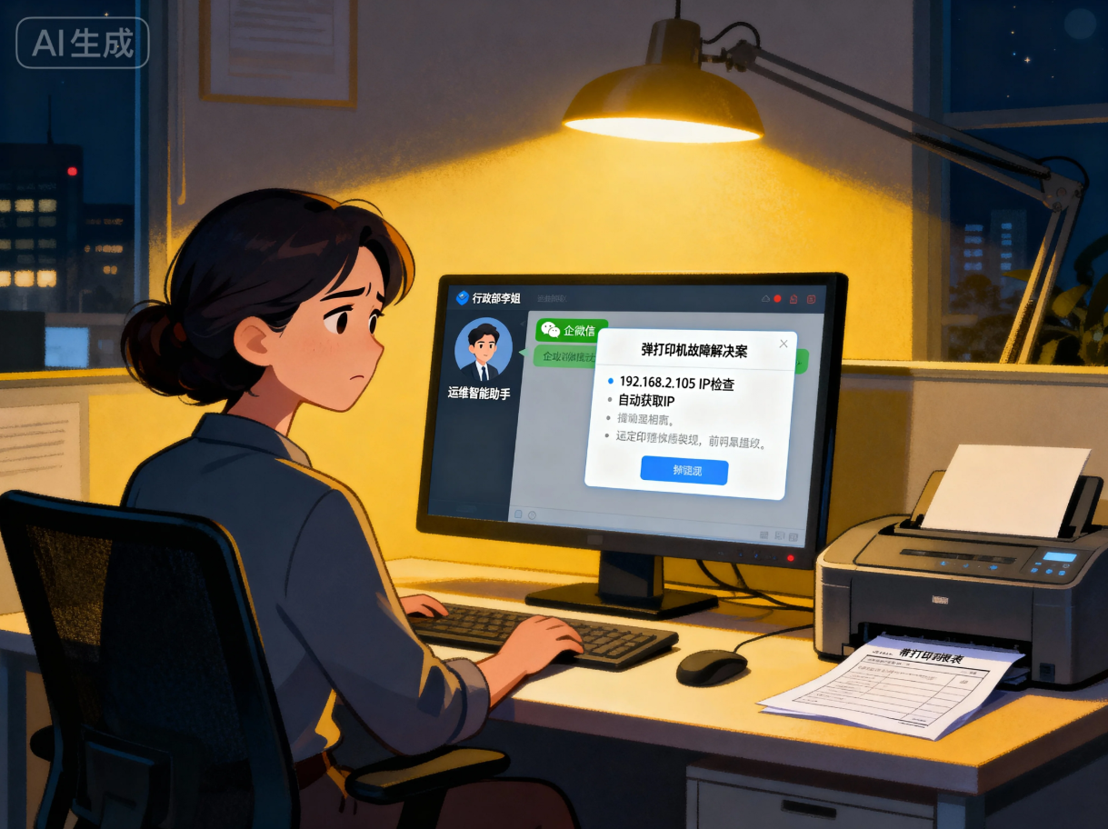晚上十点,某制造业行政部的李姐对着电脑急得直跺脚 —— 明天一早要交的报表还没打印,打印机却突然连不上了。翻遍通讯录,IT 同事大概率已经下班,她抱着试试看的心态,点开了企业微信里那个不起眼的 “运维客服” 图标。