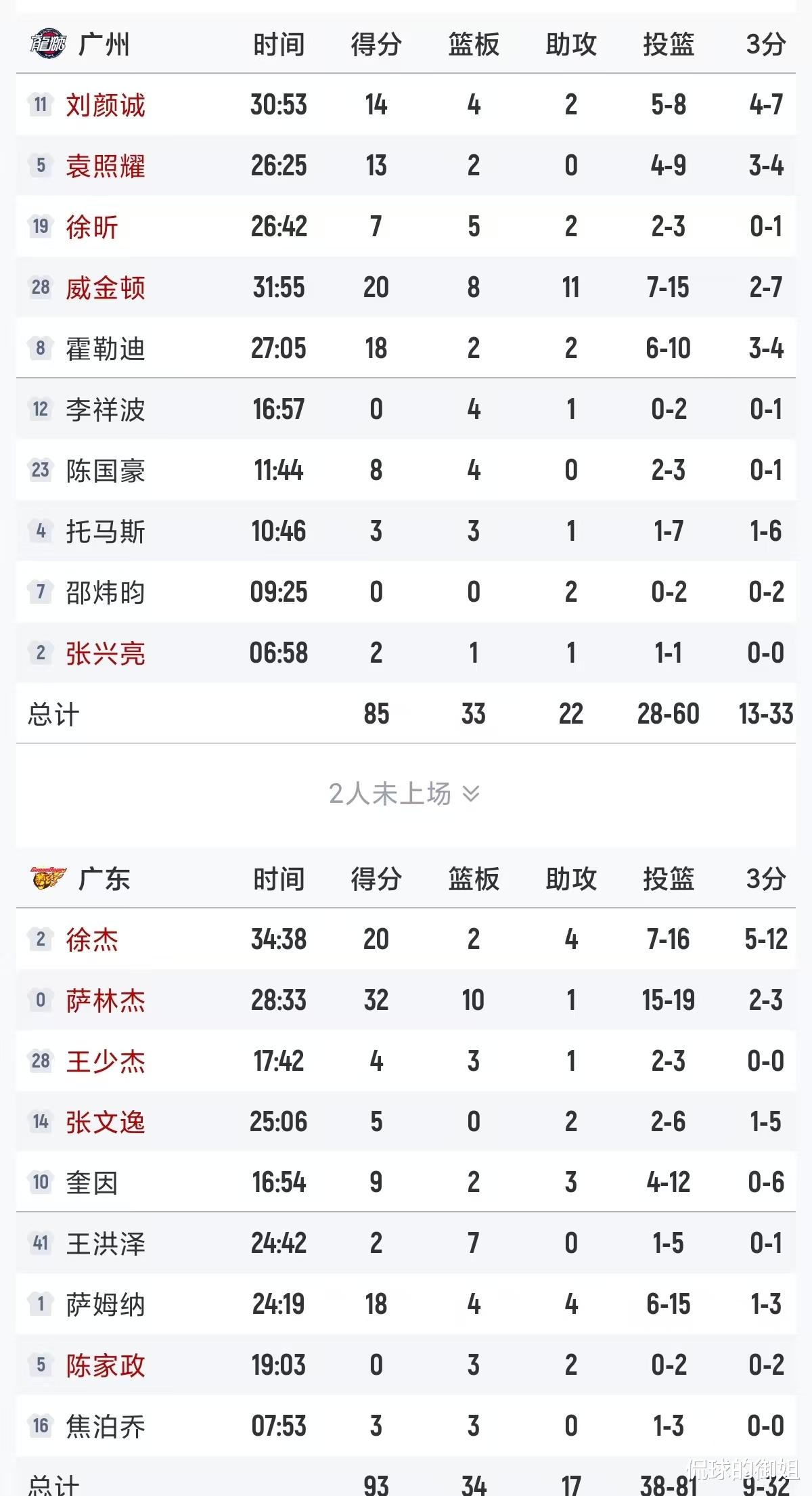 下半场易边再战,萨林杰空篮轻取两分,转换萨林杰后仰中投连得4分,威金顿急停两分打进,刘颜诚三分命中继续追分,萨林杰两分回敬,霍勒迪迅速拿下两分,徐杰抛投还以颜色,双方分差始终撕咬,随着刘颜诚三分投进广州再反超,还是萨林杰关键时刻砍分止血,徐杰三分命中稳住领先,三节战罢广东领先6分。末节比赛,广东开局一波流将分差扩大到两位数,随后广州不断追分,最终广东队93-85战胜广州。
