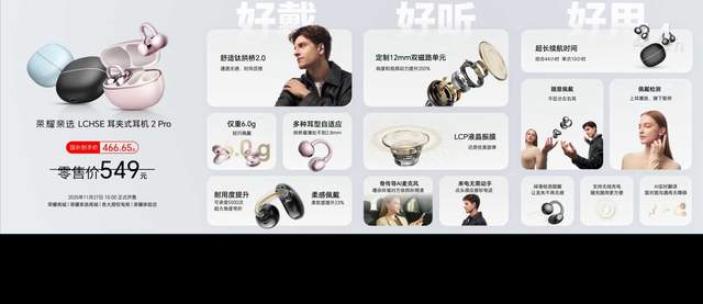 此外发布会也带来全新荣耀耳夹耳机2 Pro,搭载全新舒适钛拱桥 2.0,佩戴更舒适、听感更通透、交互更智能,搭配充电仓可达44小时续航,是当下全民耳夹时代的满配答案,国补到手价 466.65元。