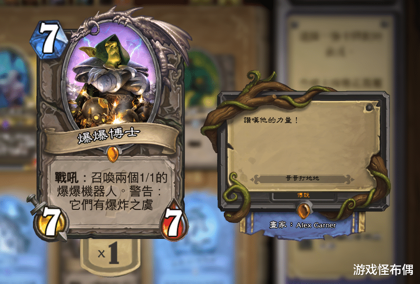 《哥哥打地地》为炉石玩家带来了电子卡牌游戏独有的元素随机性,最经典的牌一定是7费传说手下爆爆博士,这只令人闻风丧胆的Dr. 7除了自身有7/7的超强体质,还有两只死后会对随机敌人造成1-4的随机伤害的爆爆机械人。
