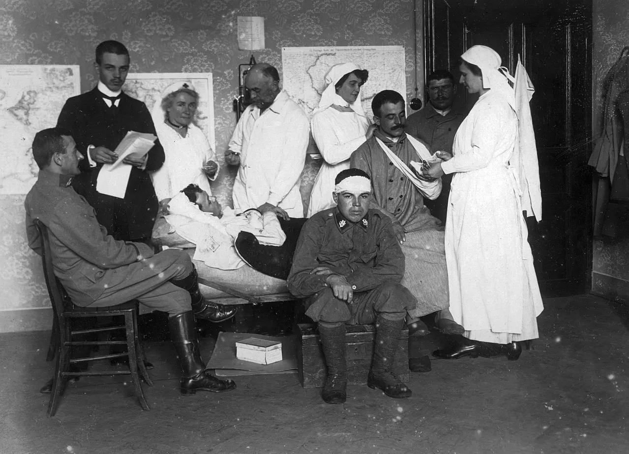 25.第一次世界大战推动了医学的进步。医生们学会了更好的伤口处理和骨骼固定方法。英国医生哈罗德-吉利斯开创了植皮手术。一战中需要医疗护理的人数众多,这让医生和护士学到了专业化和专业管理的优势。