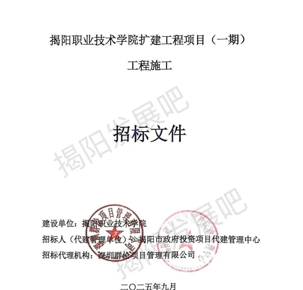 根据揭阳职业技术学院(公办专科)扩建工程项目(一期)工程施工招标公告内容: