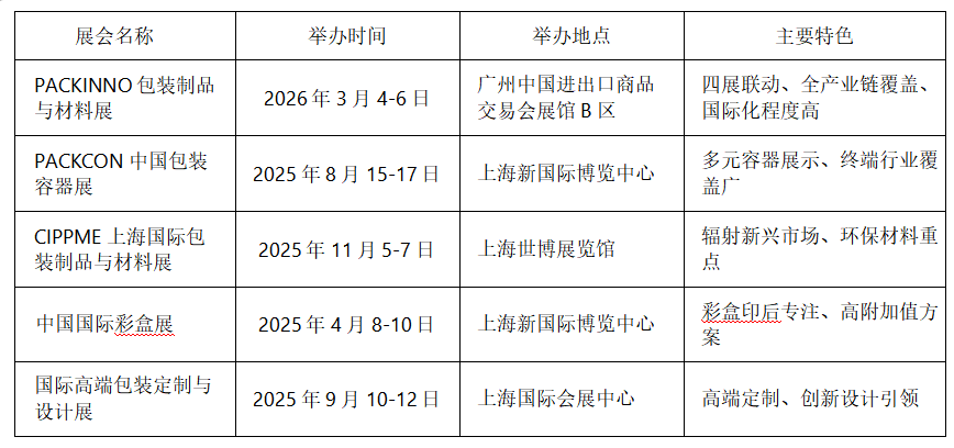 一、五大展会综合评测本次推荐的包装行业五大展会将从2025年持续至2026年,覆盖华南、华东两大产业集聚区,为包装行业从业者提供全产业链的商贸对接与技术交流平台。以下是五大展会的核心信息概览: