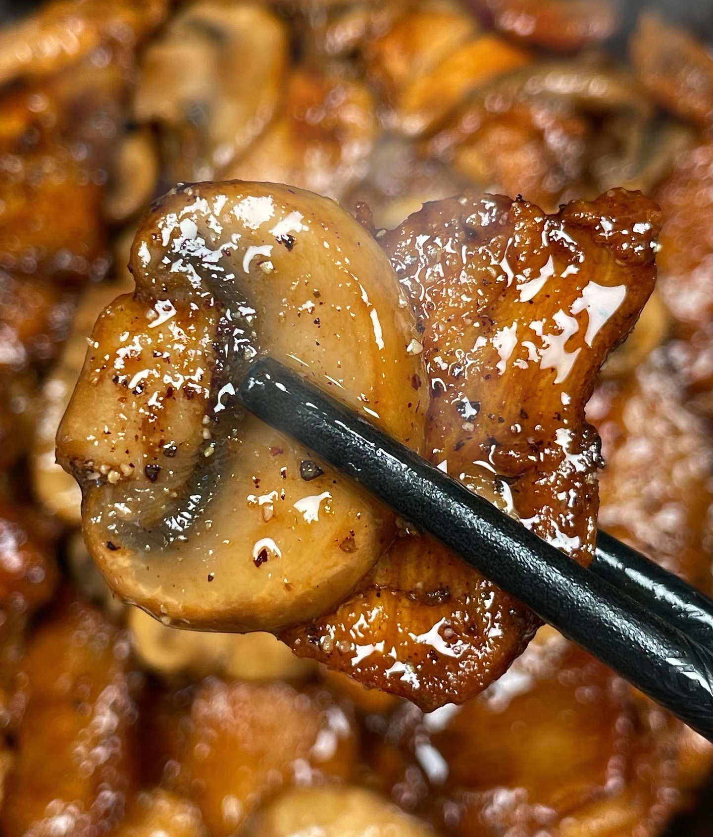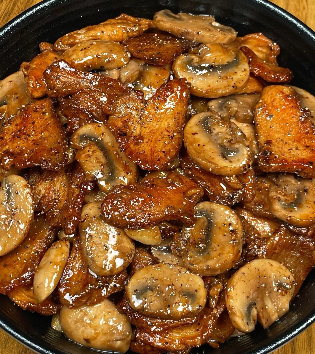 4. 混合烹饪:将煎好的鸡胸肉重新倒入锅中,加入一勺生抽、一勺蚝油、撒上些许黑胡椒碎,快速翻炒,让鸡肉和口蘑充分融合,黑胡椒的香气弥漫开来,使得整个菜肴的味道更加浓郁。