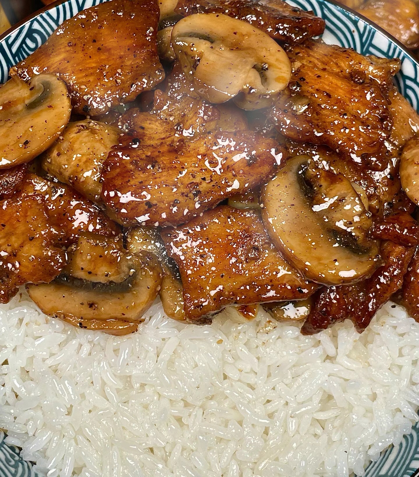 鸡胸肉、口蘑、蒜末、生抽、蚝油、料酒、淀粉、黑胡椒碎、黑胡椒粉、盐、食用油