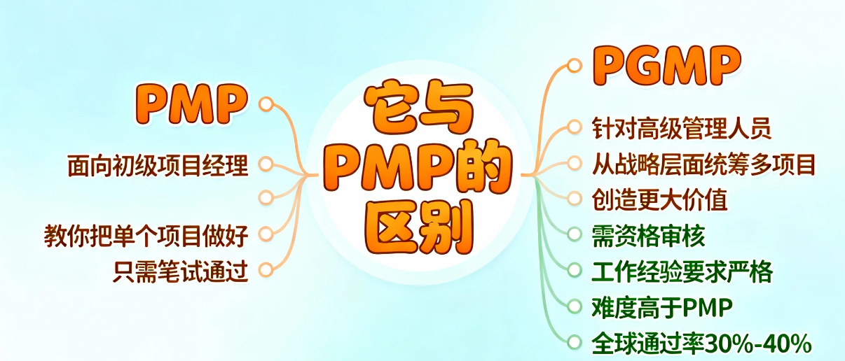 它和PMP的区别真挺明显。PMP面向刚入行的项目经理,重点教你把单个项目做细做好;PgMP针对有经验的管理人员,核心是教你“牵住主线”,让多个项目拧成一股绳创造更大价值。PMP只要笔试过了就能拿证,PgMP得先过资格审核,对工作经验要求挺严,全球通过率也就30%-40%,难度确实高不少。