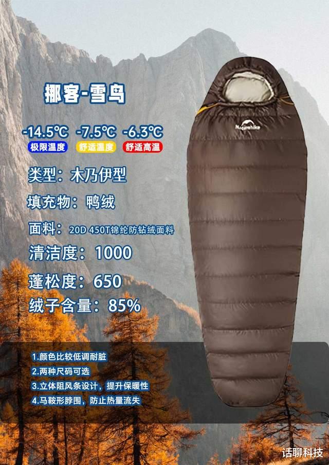 3. 参数均衡无短板:650FP拒水鸭绒+90%绒子含量,RDS认证再加上1000+洁净度,填充品质很高,保暖足够应对北方初冬;1070g重量对新手背负友好;石墨烯里层的抗菌、抗静电功能,避免“长期使用有异味”“粘头发粘衣服”的尴尬,提升露营舒适度。