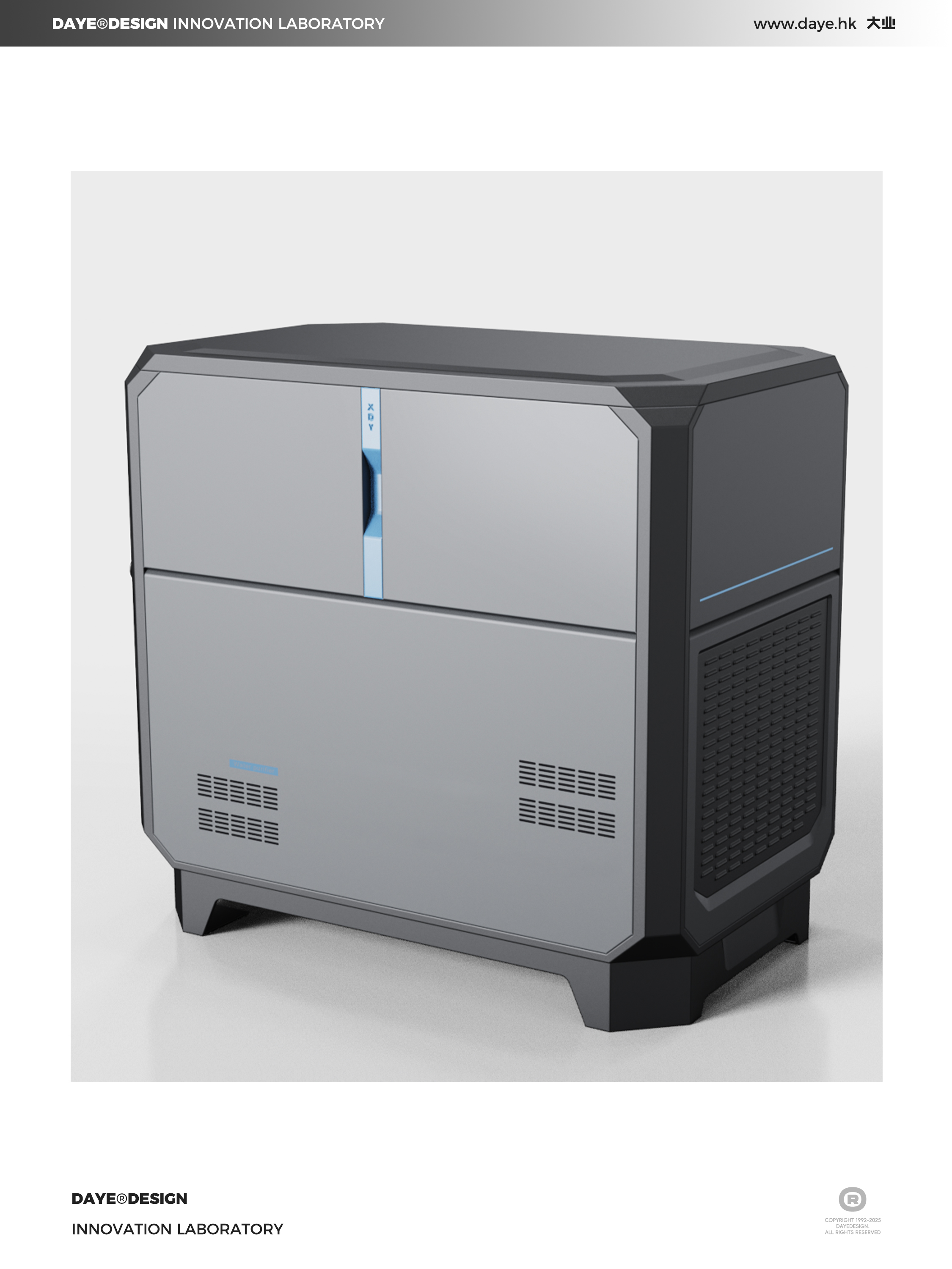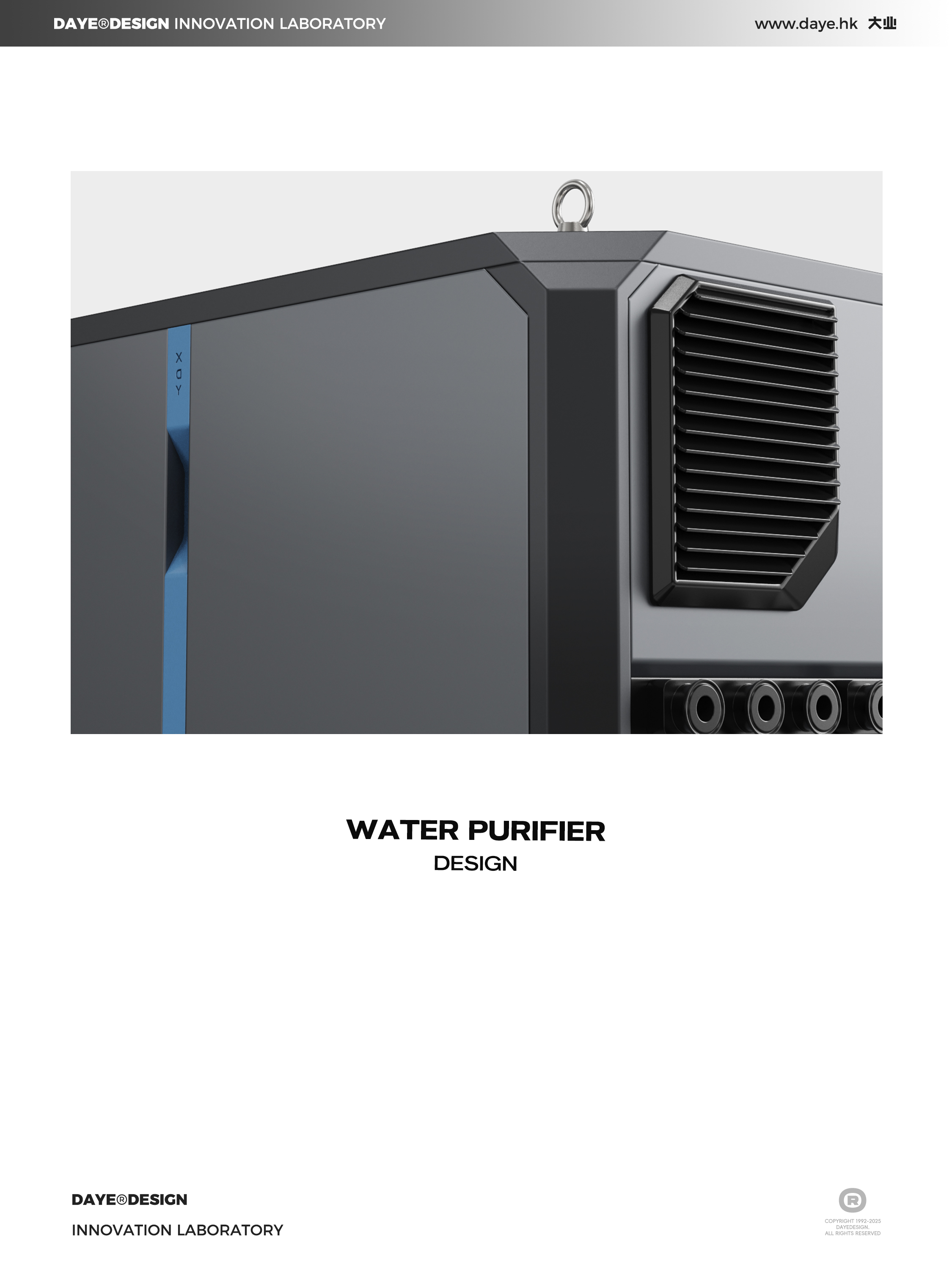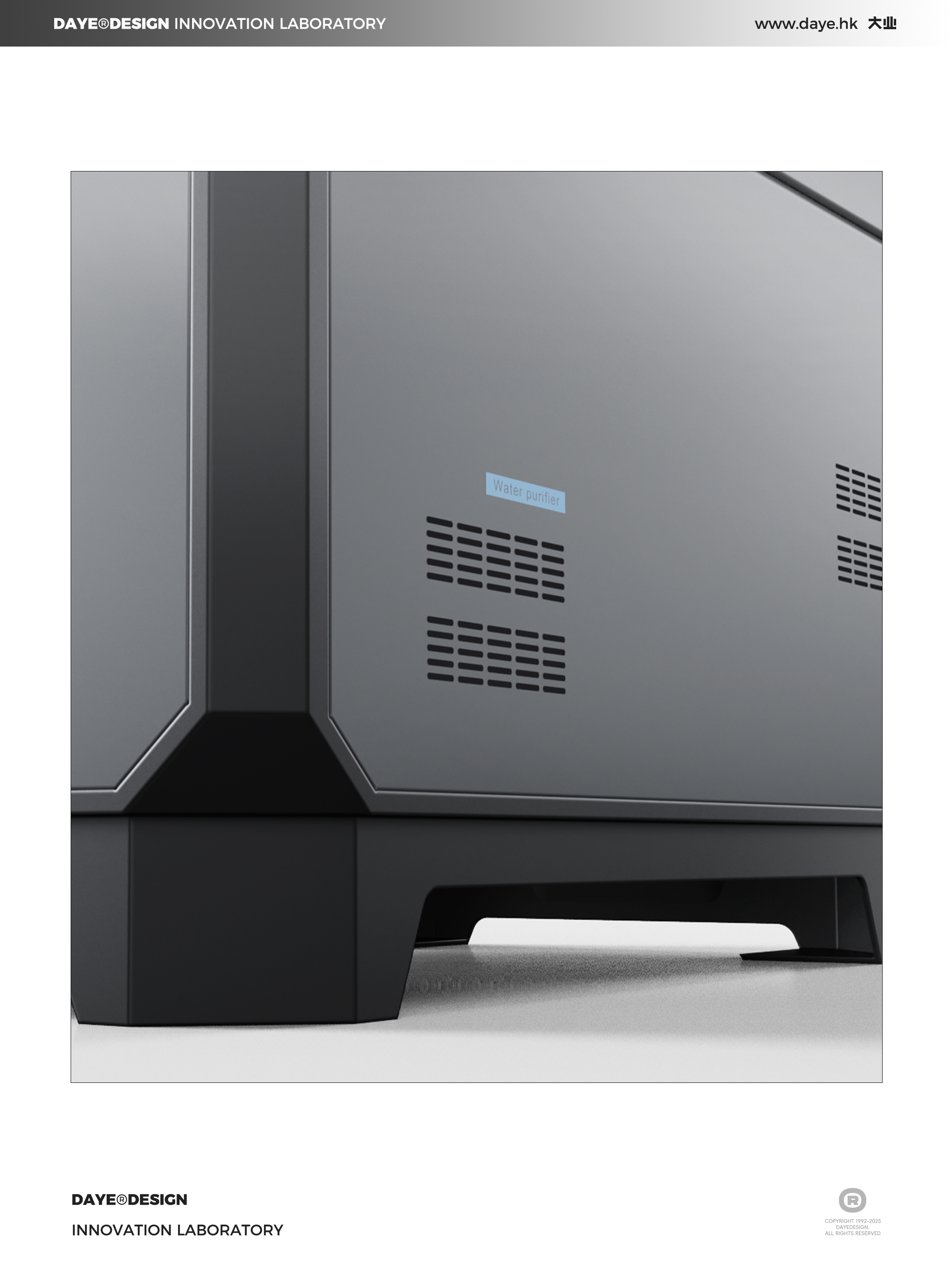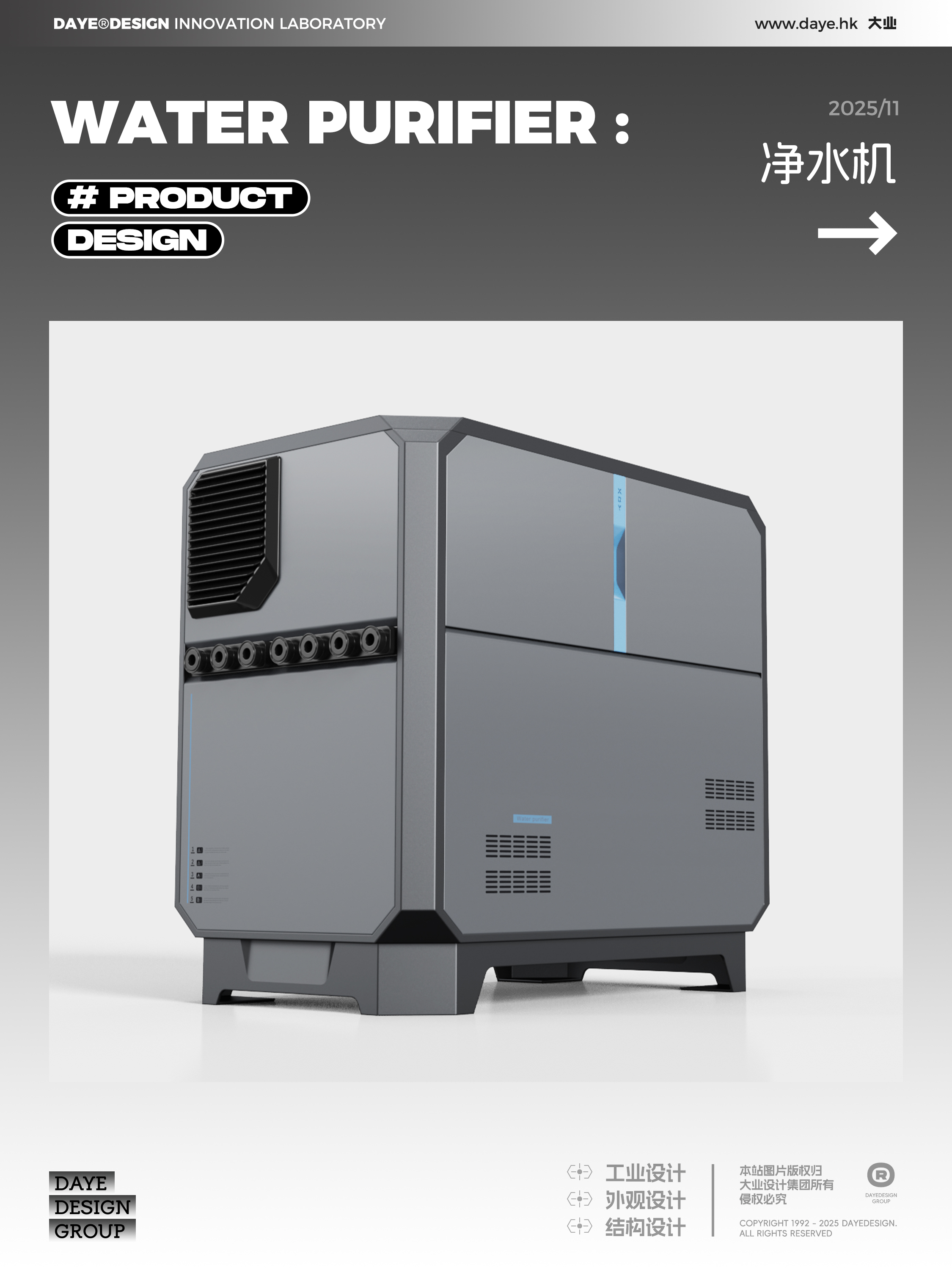 产品采用深灰为主的工业配色体系,传递净水设备的产品属性;蓝色装饰条作为视觉焦点,既在功能上划分核心模块,又在视觉上形成 “科技感” 的点缀,消解工业设备的沉闷感,同时传递 “净水科技” 的产品定位。 整体遵循几何块面化的模块化造型,设备主体的棱角分明的块面组合(进水区、净水区、控制区)清晰划分功能模块,既保障了净水流程的合理性,又让外观具备 “工业精密仪器” 的结构秩序感。底部的支架设计,在功能上满足设备的稳定放置需求,在视觉上强化了 “工业设备” 的专业形态特征。#产品设计#设计分享#工业设计公司#外观设计#净水器#净水机设计