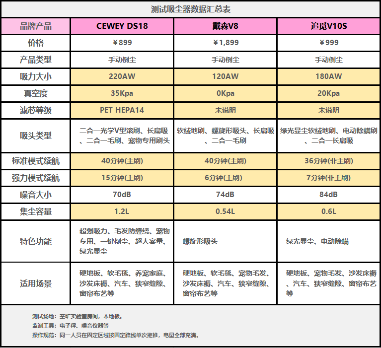 对于以上情况相信不少踩过坑的小伙伴并不陌生,因此,我找来了目前热度比较高的几款吸尘器分别是:CEWEY、戴森、追觅。全文不讲花哨术语、不堆砌专业数据,直接对吸尘器进行全方位的测评对比。为了方便大家对比,我整理了以下参数表格大家可以看一下: