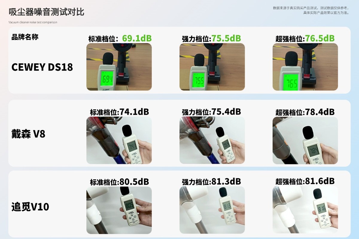 测试总结:噪音控制优秀:CEWEY噪音控制良好:戴森噪音控制一般:追觅在这项测试里,CEWEY DS18 的表现特别让人满意,在低档和中档时,噪音特别柔和,就算离得近也不会觉得吵,平时在家打扫,就算家人在旁边看电视也不受影响;就算是强档运行,分贝值也控制在能接受的范围内,而且高频噪音抑制得很好,长时间用也不会觉得耳朵疼。