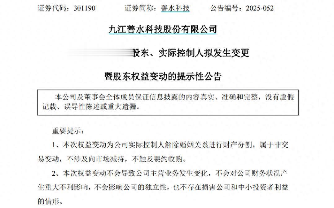 11月7日,善水科技发布公告称,公司实际控制人黄国荣和吴新艳解除婚姻关系,并进行财产分割。
