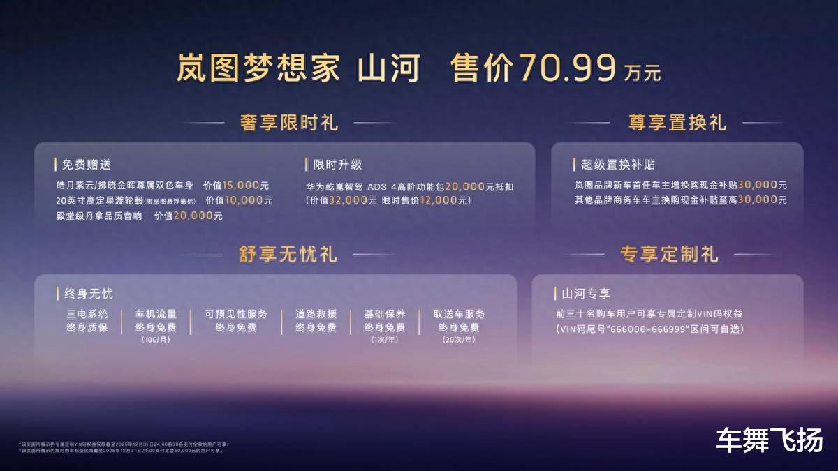 【2025年11月21日 广州】11月21日,广州车展盛大启幕,“新时代旗舰四座MPV”岚图梦想家山河正式上市,售价70.99万元。同步推出山河专属四重礼,包含皓月紫云/拂晓金辉尊属双色车身、20英寸高定星漩轮毂(带岚图悬浮徽标),及殿堂级丹拿品质音响;华为乾崑智驾ADS 4高阶功能包现金抵扣;超级置换补贴;专属定制VIN码权益;三电系统终身质保、车机流量终身免费、道路救援终身免费等权益。