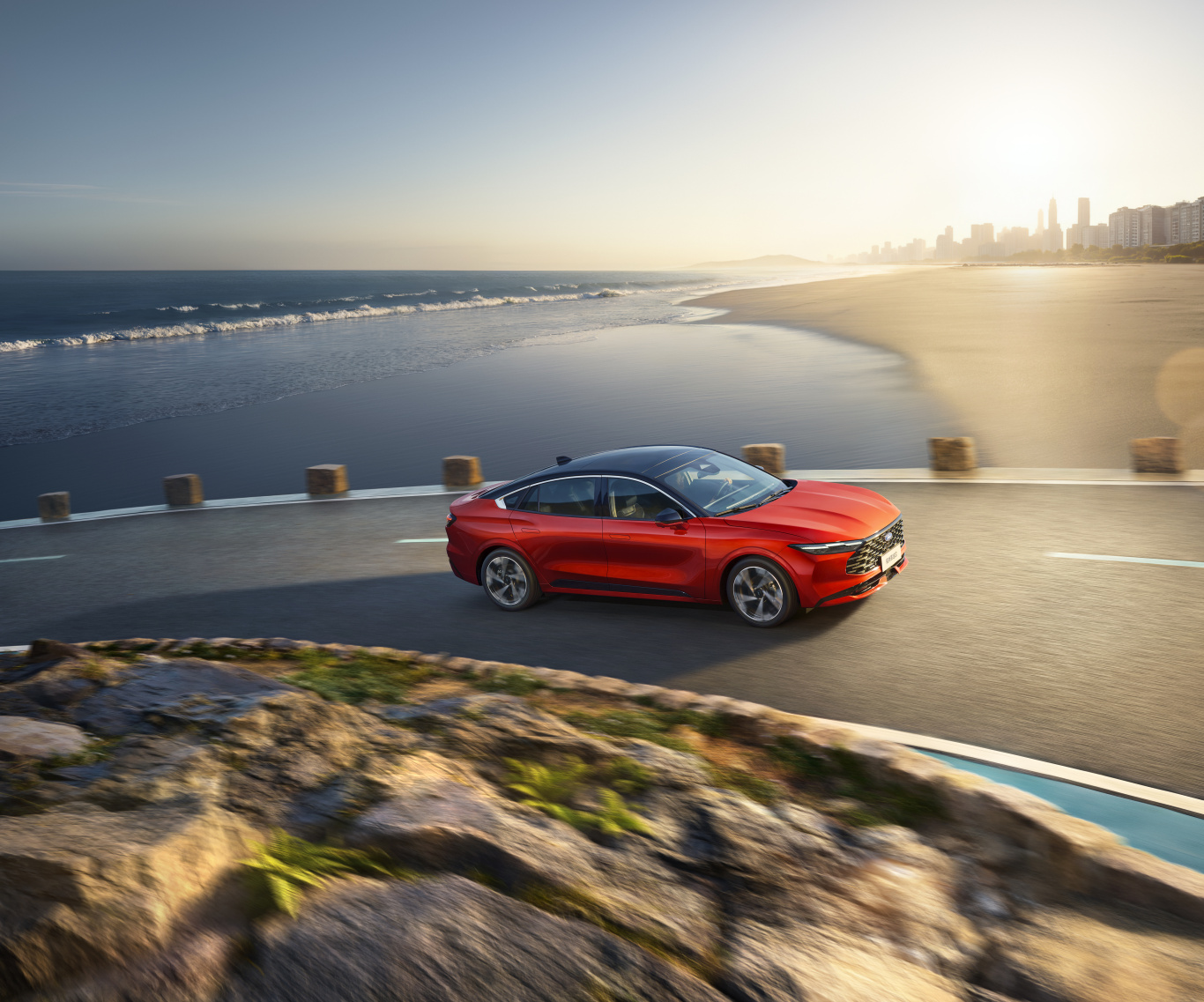 福特新蒙迪欧融合美式运动基因与大气设计语言,前脸采用“低趴宽体”设计,压低车头、拉伸视觉宽度,配合俯冲式下沉线条与修长大灯,强化动感姿态。前大灯内置三条错落灯带,搭配“Ford LED”烫印,提升科技感。
