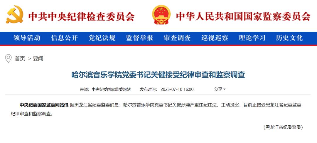 7月10日,据黑龙江省纪委监委消息:哈尔滨音乐学院党委书记关健涉嫌严重违纪违法,主动投案,目前正接受纪律审查和监察调查。