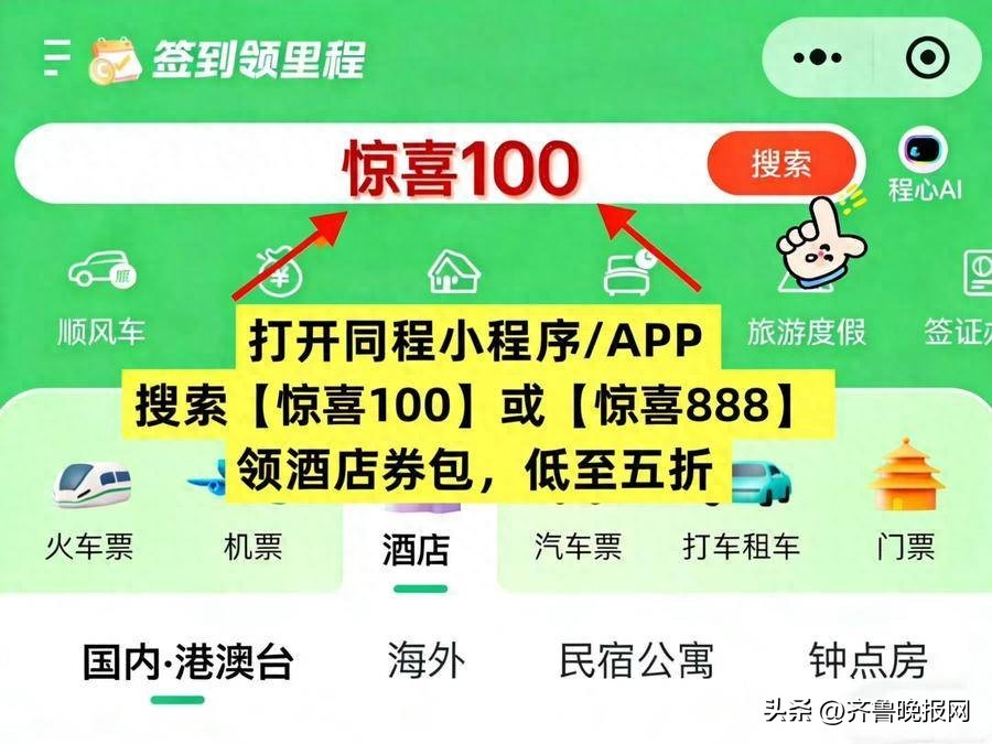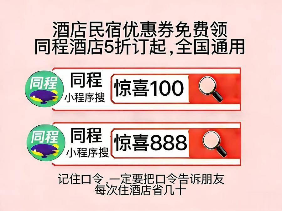 同程小程序搜【惊喜100】,即可领取全品类酒店通用大额满减券,高星酒店、品牌连锁、平价民宿全覆盖,下单立减更划算。
