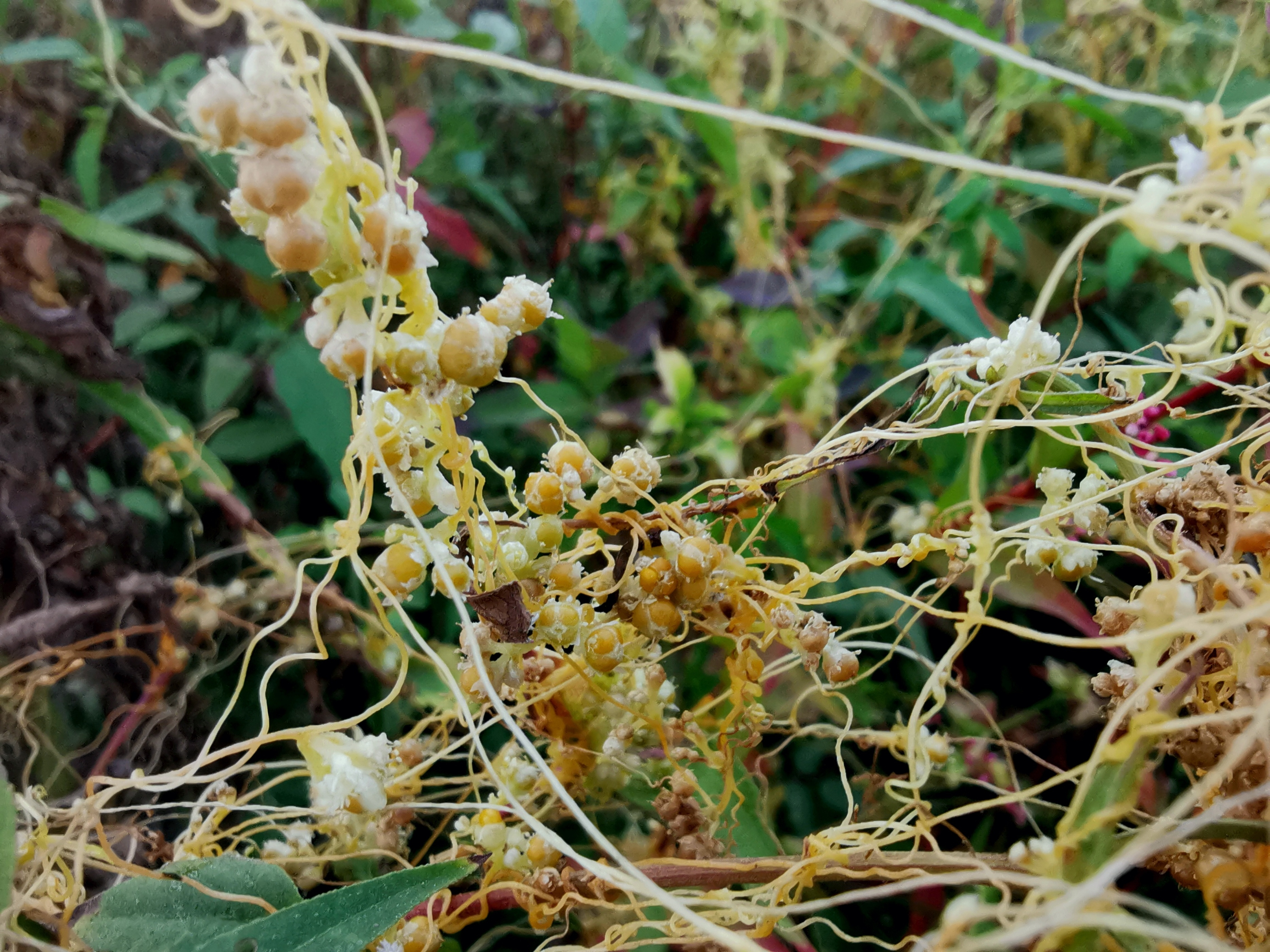 菟丝子 旋花科植物菟丝子的干燥成熟种子,该植物是一种寄生植物,主要寄生在豆科、菊科等植物上,通过宿主获取能量,年幼时缠绕茎呈现淡黄色,秋季九月植株开始变干枯,预示着种子也即将成熟,可以开始采收。