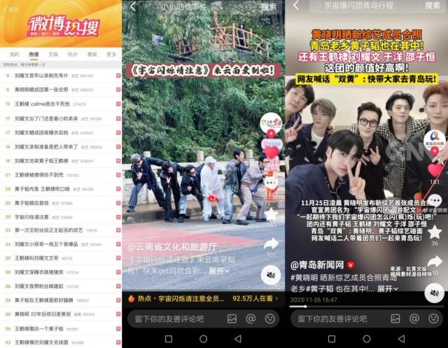 《宇宙闪烁请注意》这几天的路透多到根本看不完,节目才录四天就斩获全网690+榜单,收获超多爆款视频,截至完稿前节目话题#宇宙闪烁请注意#微博阅读量1.2亿,节目话题#宇宙闪烁请注意 在抖音和快手平台上视频总播放量超六千三百万,多个路透等话题引发全网热议。不仅普通网友在看,官方媒体也在实时追更,全网超36家文旅及地方媒体在线追踪宇宙爆闪团踪迹,和宇宙爆闪团一起云疯玩。