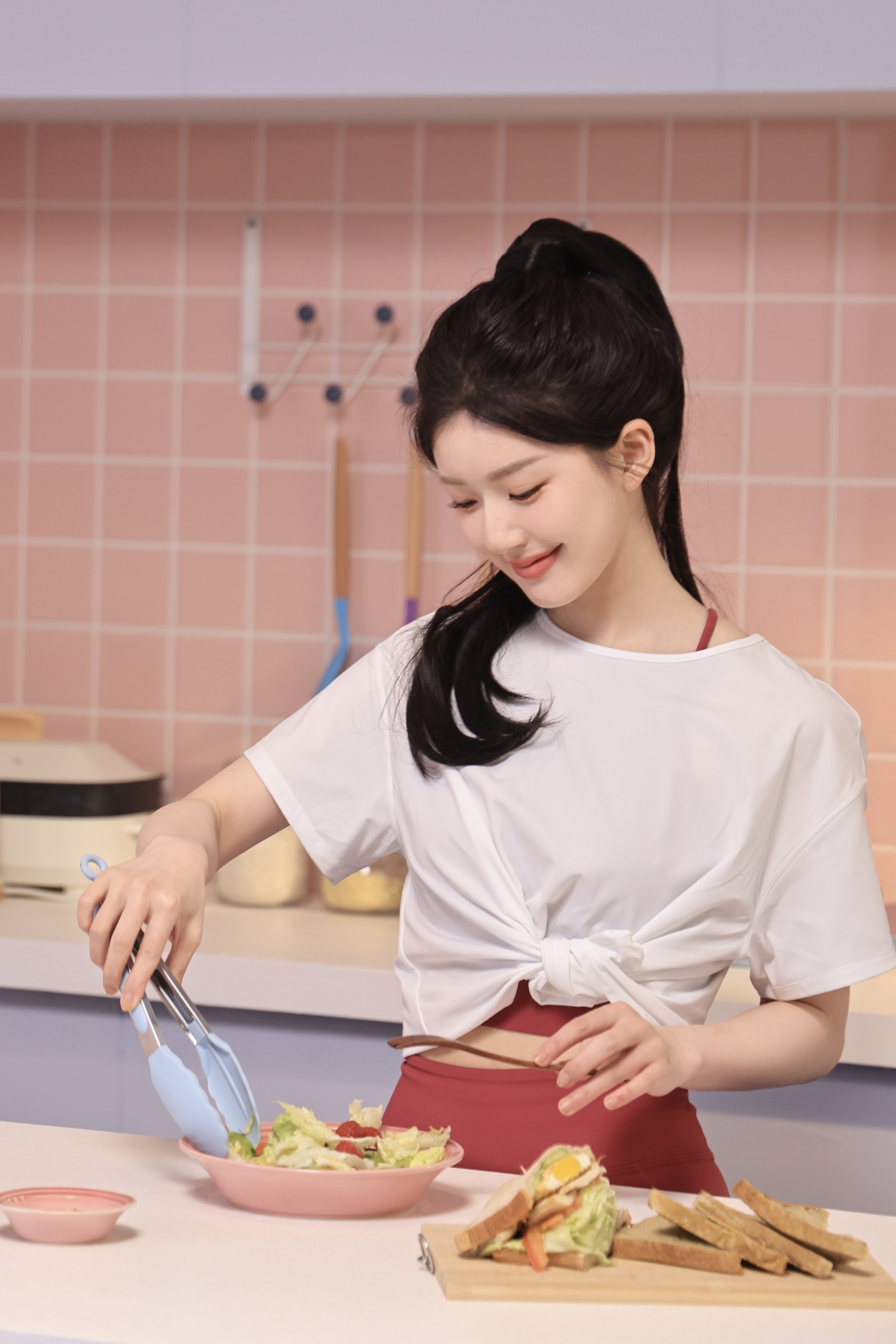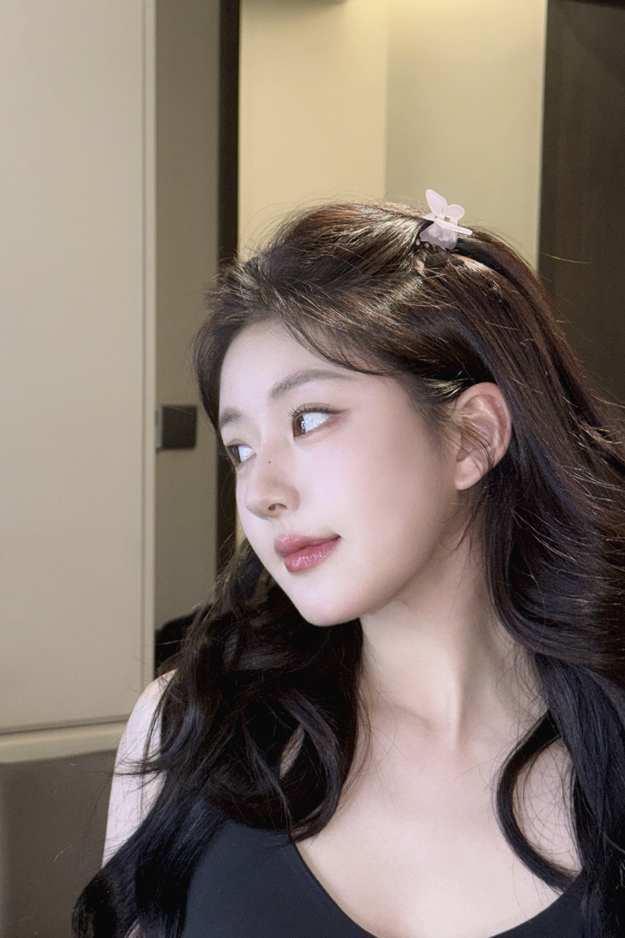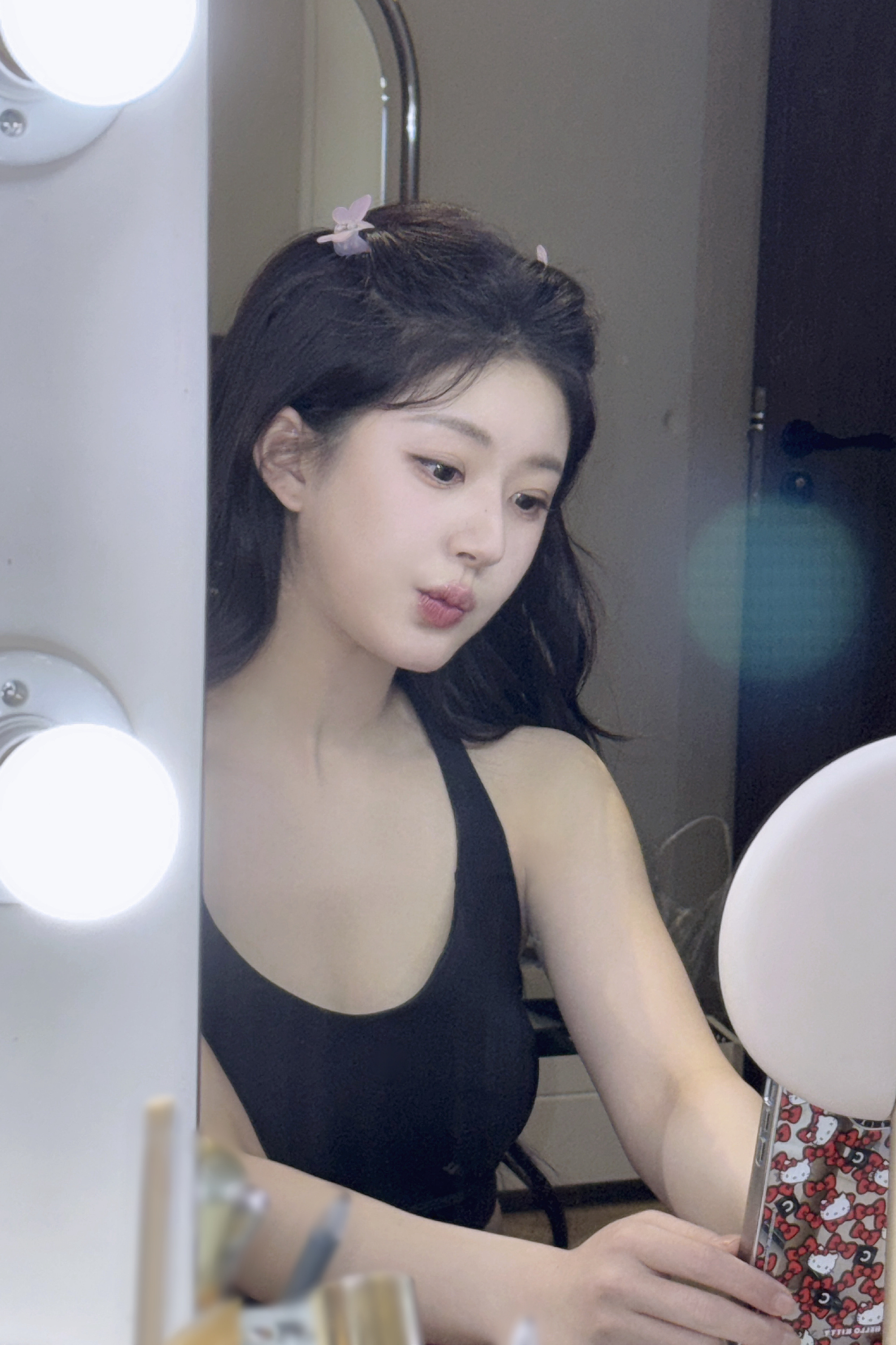 更戳人的是这张脸:高马尾利落得像根小鞭子,发尾却带点自然的卷度,衬得下颌线清瘦又软;唇色是淡淡的奶茶粉,眼尾微微上翘,可眼神一抬还是软乎乎的无辜感,连笑起来的苹果肌都透着甜妹专属的“幼态感”。