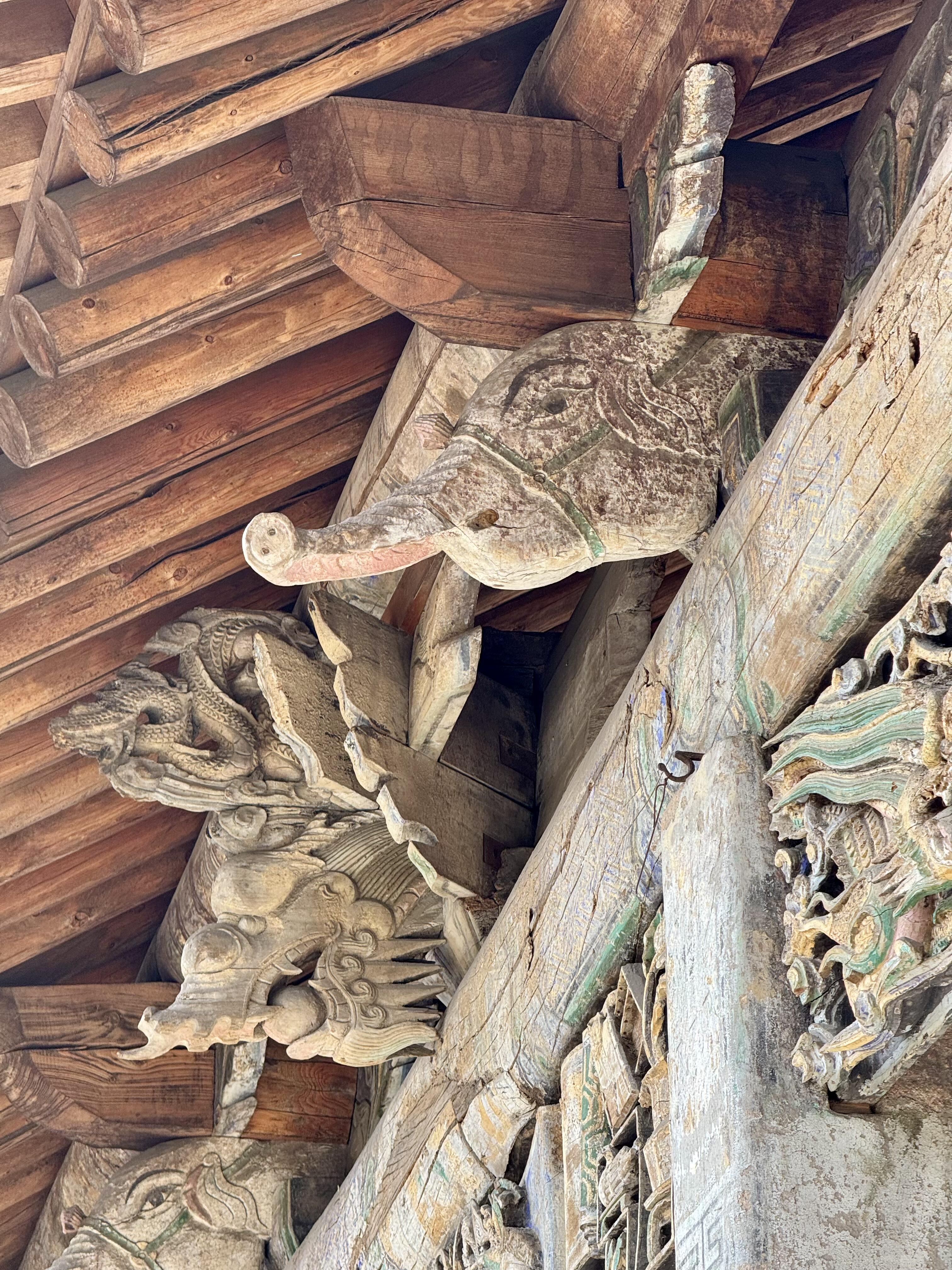 后殿的画风却突然变得拧巴。金代的梁架被清代工匠强行"整容",原本舒展的悬山顶被生生压成硬山顶,转角铺作憋屈地嵌在山墙里,像穿错衣服的巨人。东耳殿倒是意外之喜,元代的驼峰、叉手还保持着原始的模样,粗犷的木纹里仿佛还留着蒙古匠人挥斧的力道。须弥座上的牡丹、忍冬纹雕刻得深浅有致,与晋城青莲寺金代石座对比,连卷叶的弧度都如出一辙——原来八百年前,晋东南的工匠们早就在悄悄"抄作业"。
