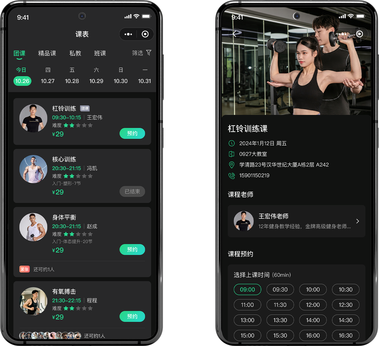 在排课约课环节,菲特云系统带来数字化变革。过去,会员约课靠电话、微信沟通,容易出现时间冲突、信息遗漏;现在,通过系统在线约课,会员可实时查看课程表、教练档期,一键预约心仪课程,方便又高效。私教也能借助系统,清晰管理自己的课程安排,合理分配精力,确保每节课都高质量交付。
