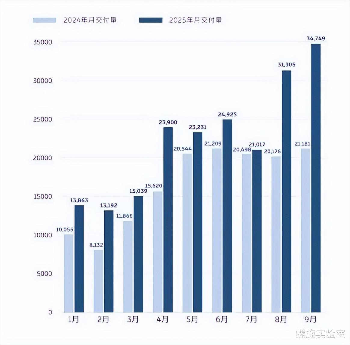 先看销量。今年9月,蔚来交付新车34,749台,同比增长64%。其中,蔚来品牌交付新车13,728台;乐道品牌交付新车15,246台;firefly萤火虫品牌交付新车5,775台。第三季度,蔚来累计交付新车8.7万辆,刷新了季度交付纪录。