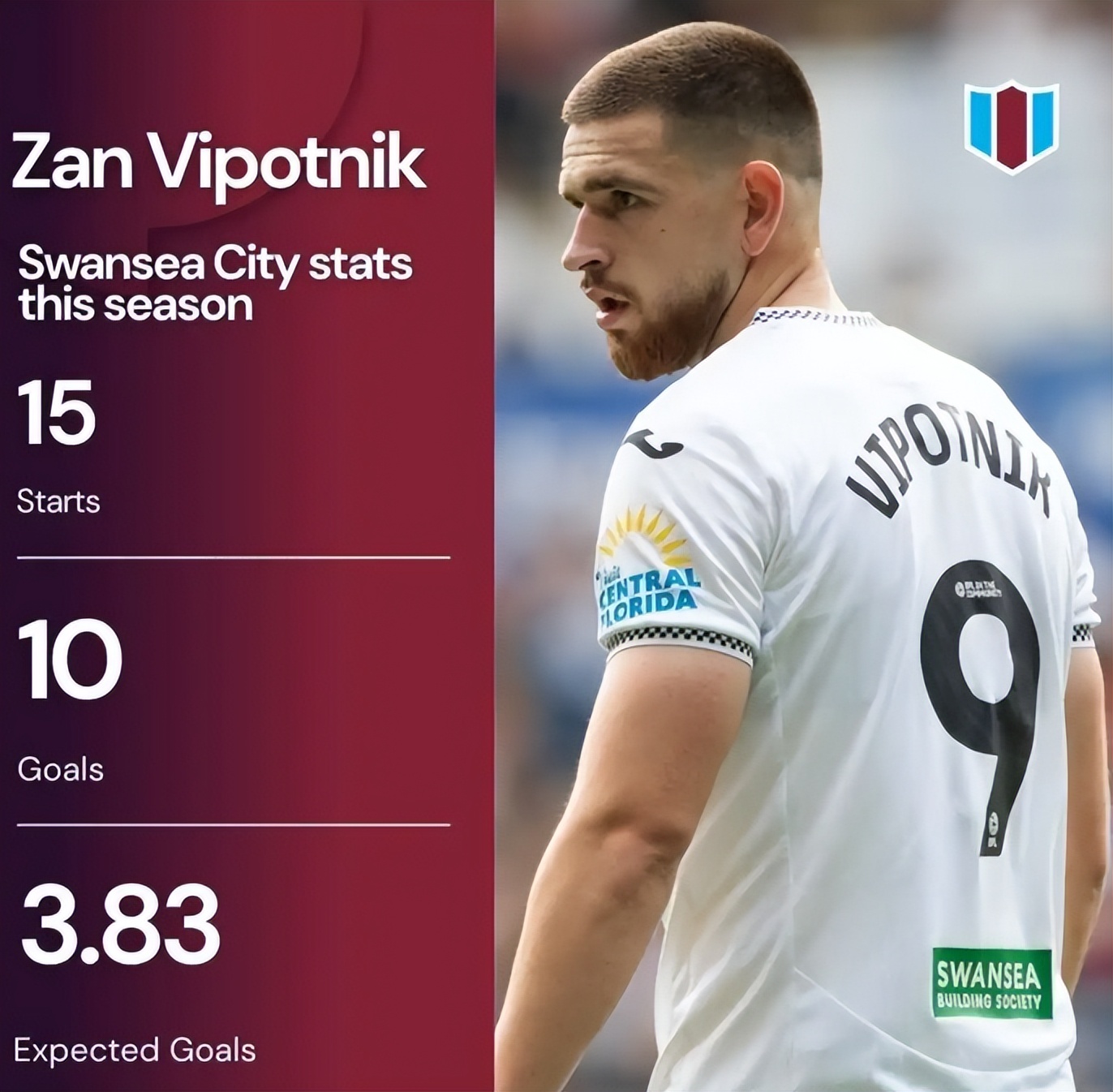 本赛季英冠联赛,斯旺西整体表现中规中矩,受限于客场战绩低迷、中场创造力不足,球队仅排在积分榜第15位,处于保级无忧、冲超无望的尴尬境地。但这丝毫没有掩盖维波特尼克的光芒,他以82脚射门轰入20球、贡献2次助攻的数据,登顶英冠射手榜,领先第二名赖特(16 球)多达 4 球,呈现断崖式领先优势。