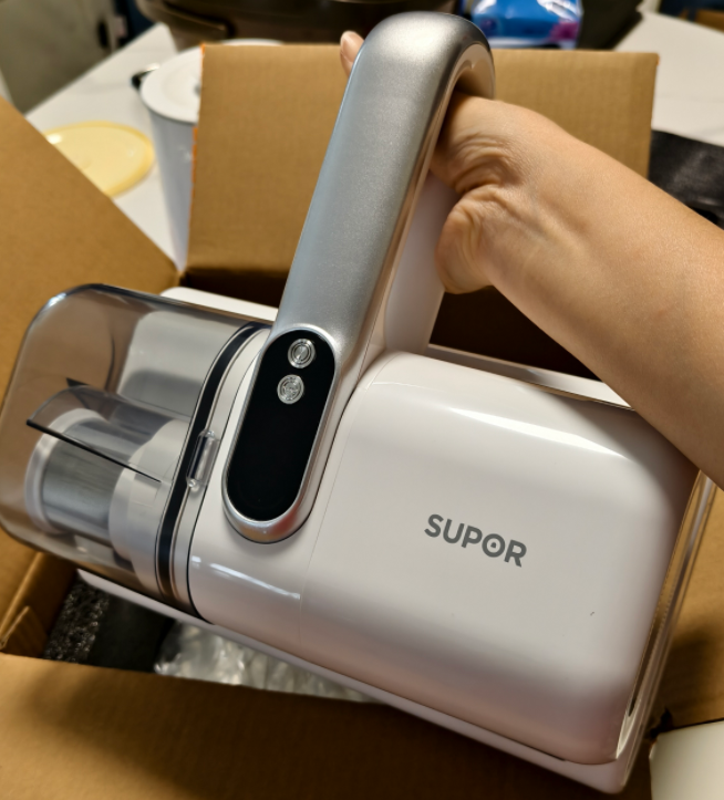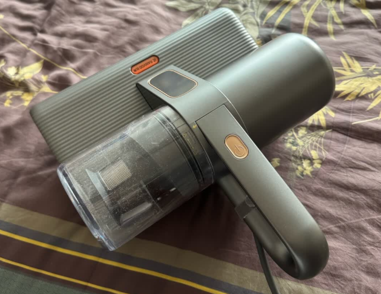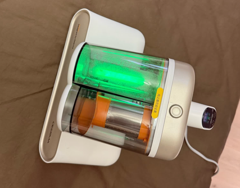 ③其他:机身仅1.6kg,采用流线型人体工学手柄,握感贴合手掌,女生单手清洁15分钟也无明显疲劳感。运行噪音经实测为68分贝,处于行业中低水平,清洁时不会干扰家人休息。配备4m加粗电源线,覆盖普通卧室床品清洁无需频繁换插座,避免无线款续航焦虑。双透明尘杯设计,尘螨收集量一目了然,支持一键拆卸,杯体和滤网均可直接水洗,晾干后重复使用,无需额外购买耗材,长期使用成本低。底部配备254nm UV-C紫外线杀菌灯,带有防漏光保护设计,抬起机身自动熄灭,使用更安全。