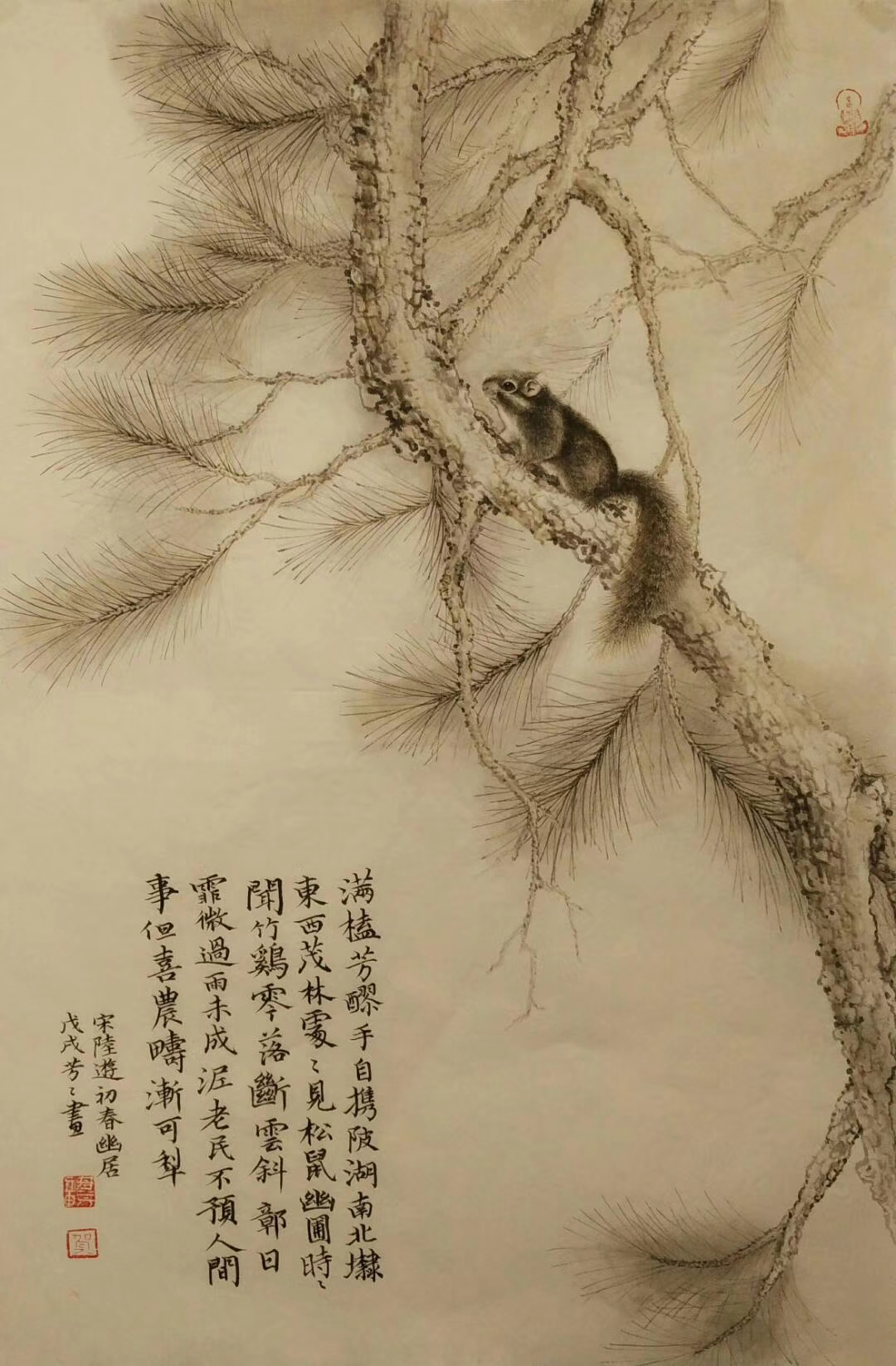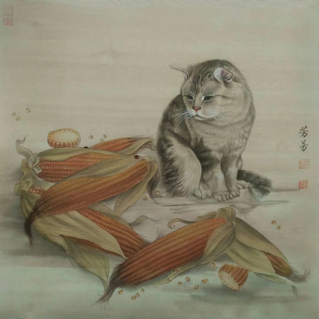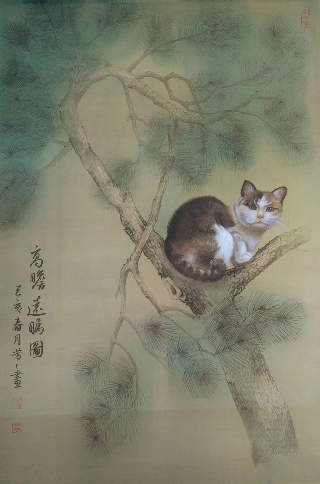 贺芳芳老师的笔墨,如晨露沾竹,在宣纸与水墨的交融中,晕染出千年文脉的幽香。其《高瞻远瞩图》中,猫踞松枝,眸中似有星子流转,恰似“银汉无声转玉盘”的静谧,又似“坐看云起时”的悠然,每一笔都藏着“天人合一”的哲思,每一墨都浸着“诗画同源”的古韵。