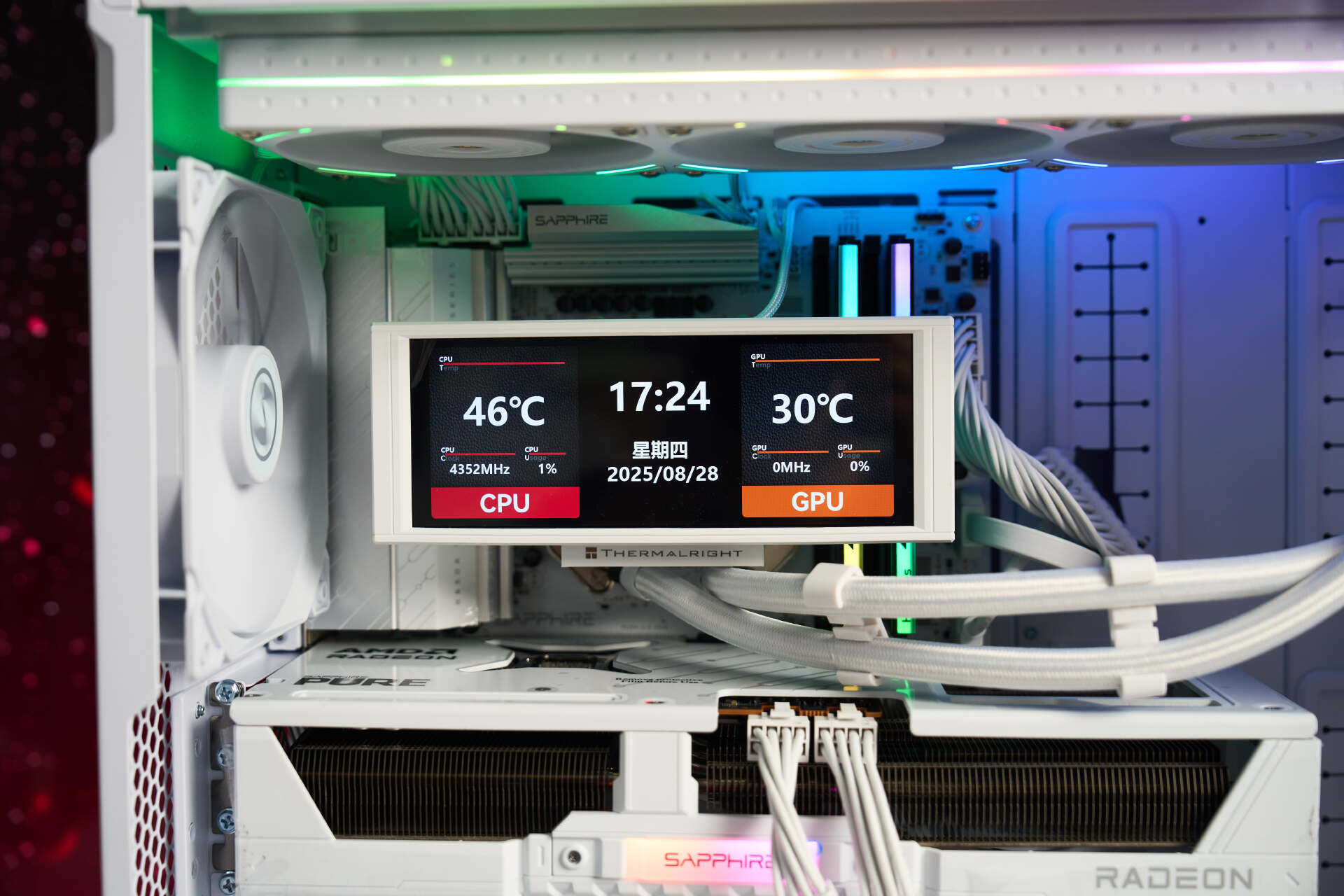 AMD的CPU虽然功耗不算特别大,但积热是个老问题了,所以我用的是利民最新的TV 360,比较有意思的是,这款水冷有个比较巨大的屏幕,从外包装就能看的出来,基本就是把曲面屏配直了。