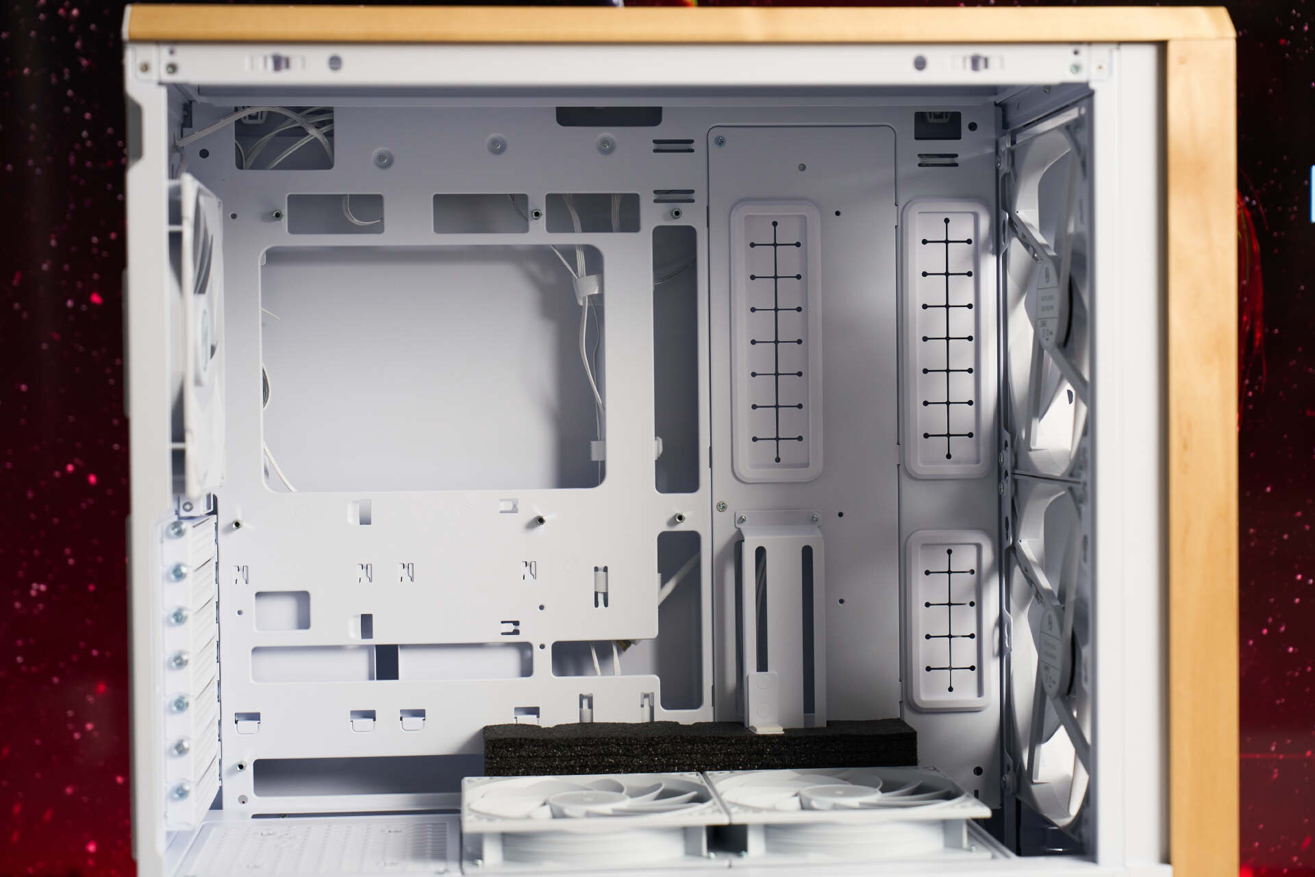 取下之后就能看到两把巨大的风扇,另外这里还要说一下,你如果非要装RGB的14CM或者12CM的风扇,联力也是给了配件的,更换配件以后就可以安装了。