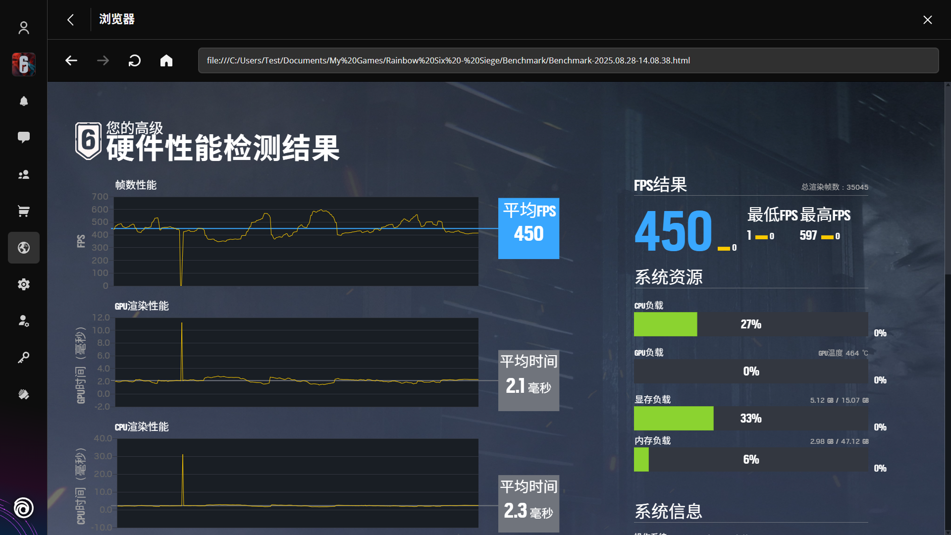 另外一款FPS网游彩虹六号围攻中,平均帧450.6 帧, 1% low160.6帧,和CS2其实差不多。