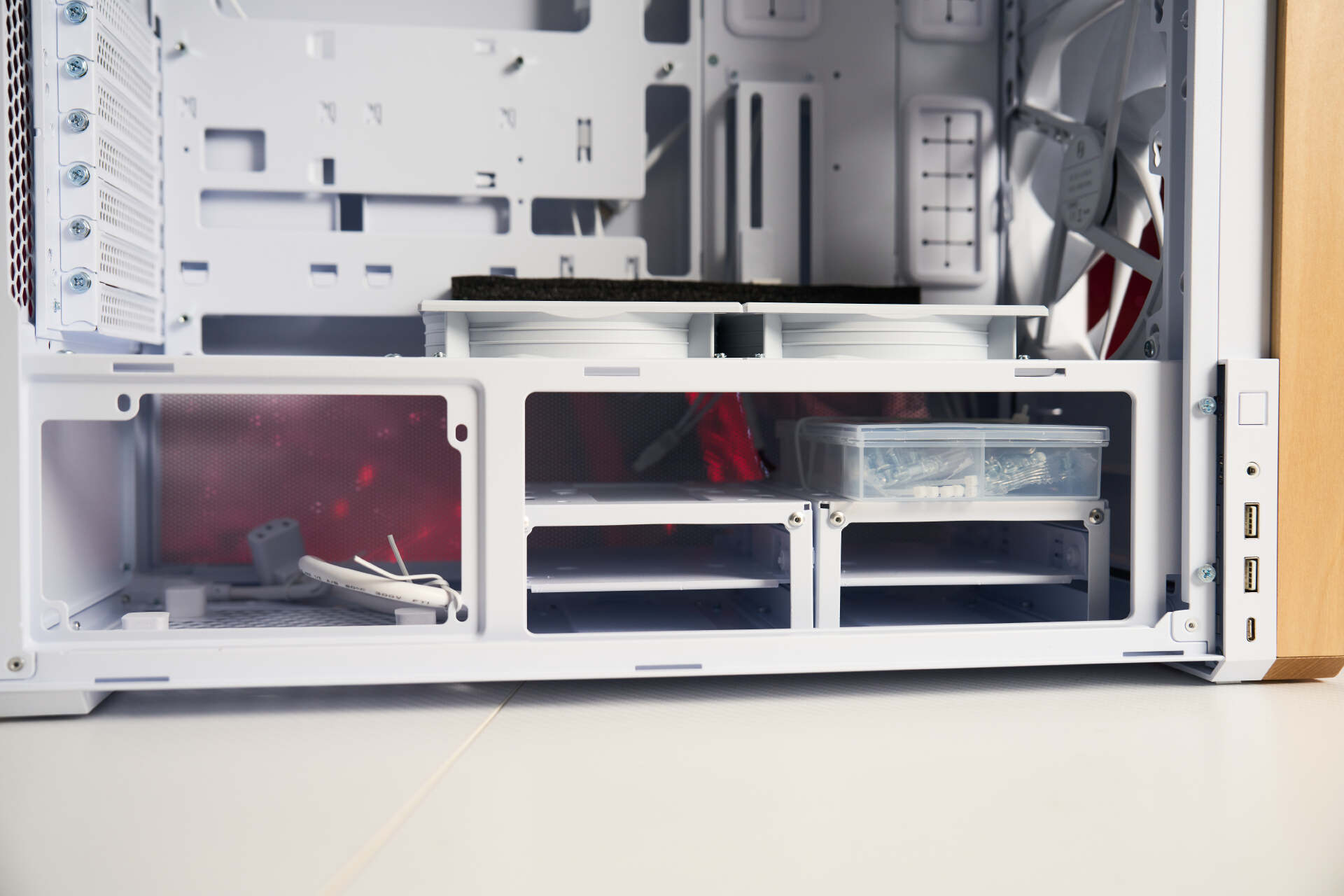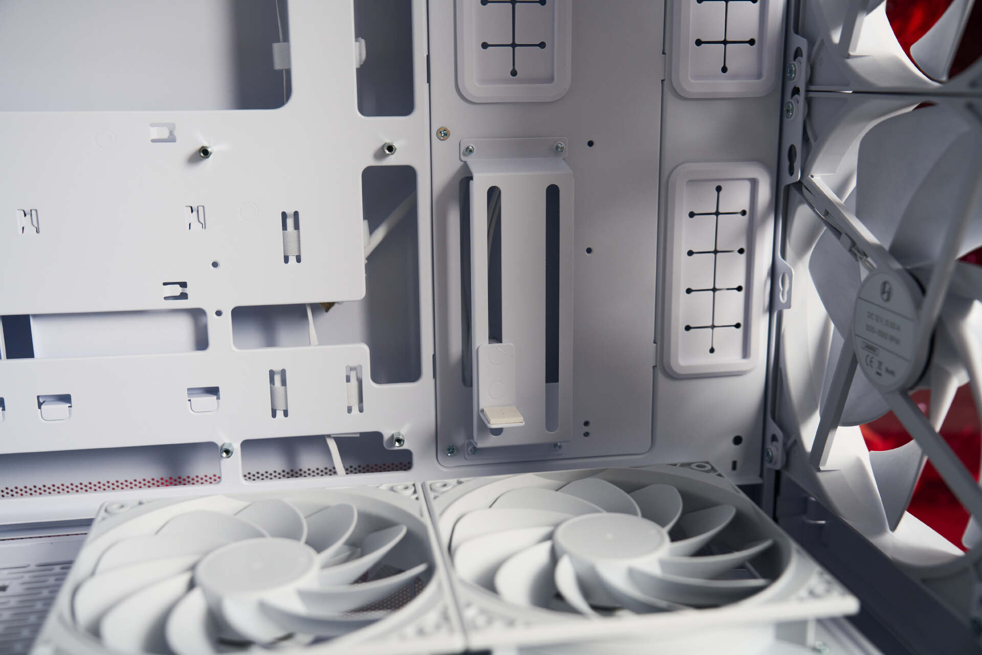 下部预装了两把反向风扇,能够更好的帮助机箱散热,当然风扇也支持快拆,如果你要竖装显卡,也可以把风扇撞到下面的硬盘仓里。