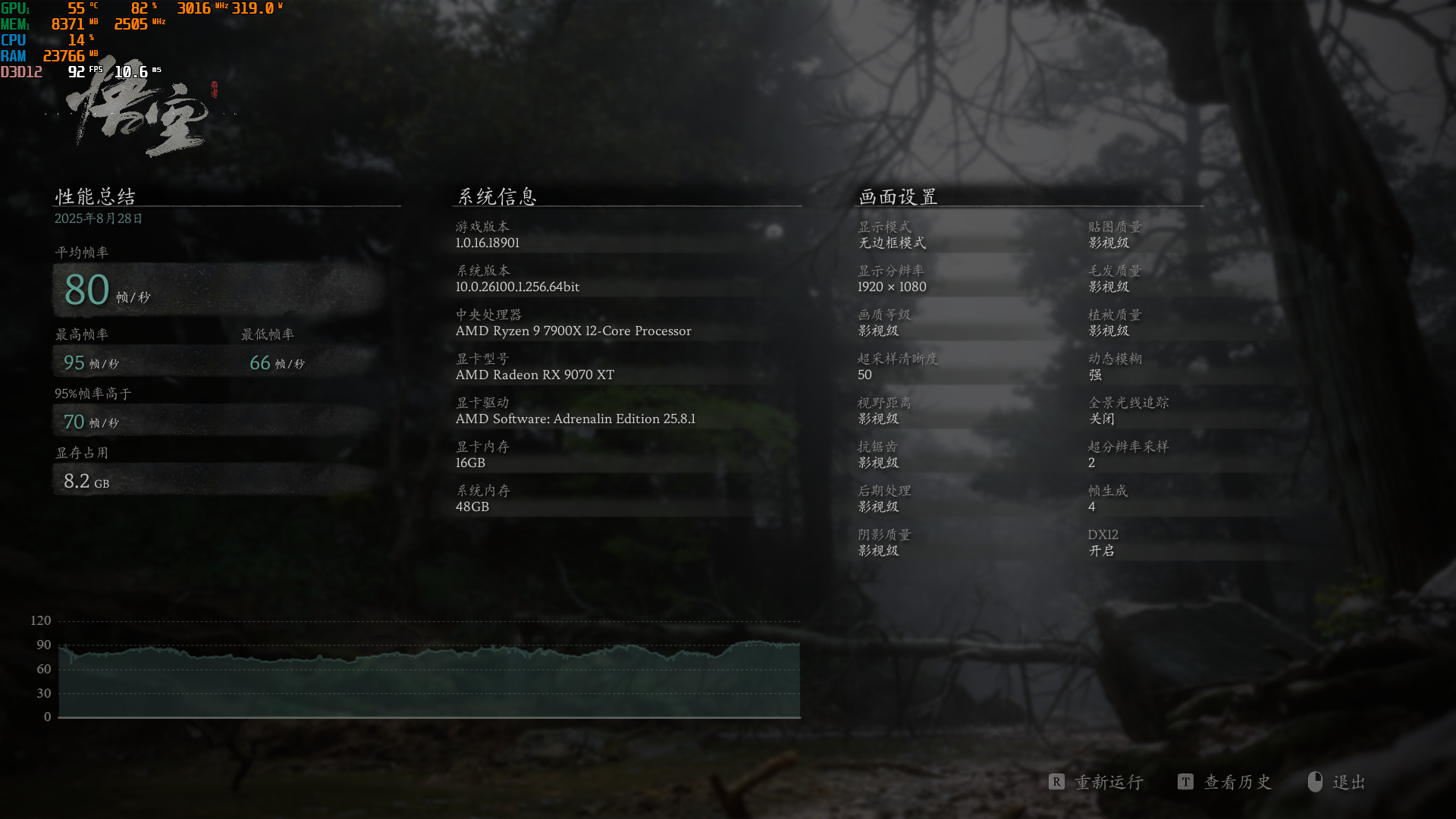 最后测试一下黑猴,依然是影视级画质,超采样50,打开FSR,平均帧79.8 帧, 1% low 66.1帧,感觉黑猴对AMD不太友好啊,这个帧率是低了,不过想想我之前是打开DLSS4的,如果没有DLSS4的话,帧率应该是一致的。