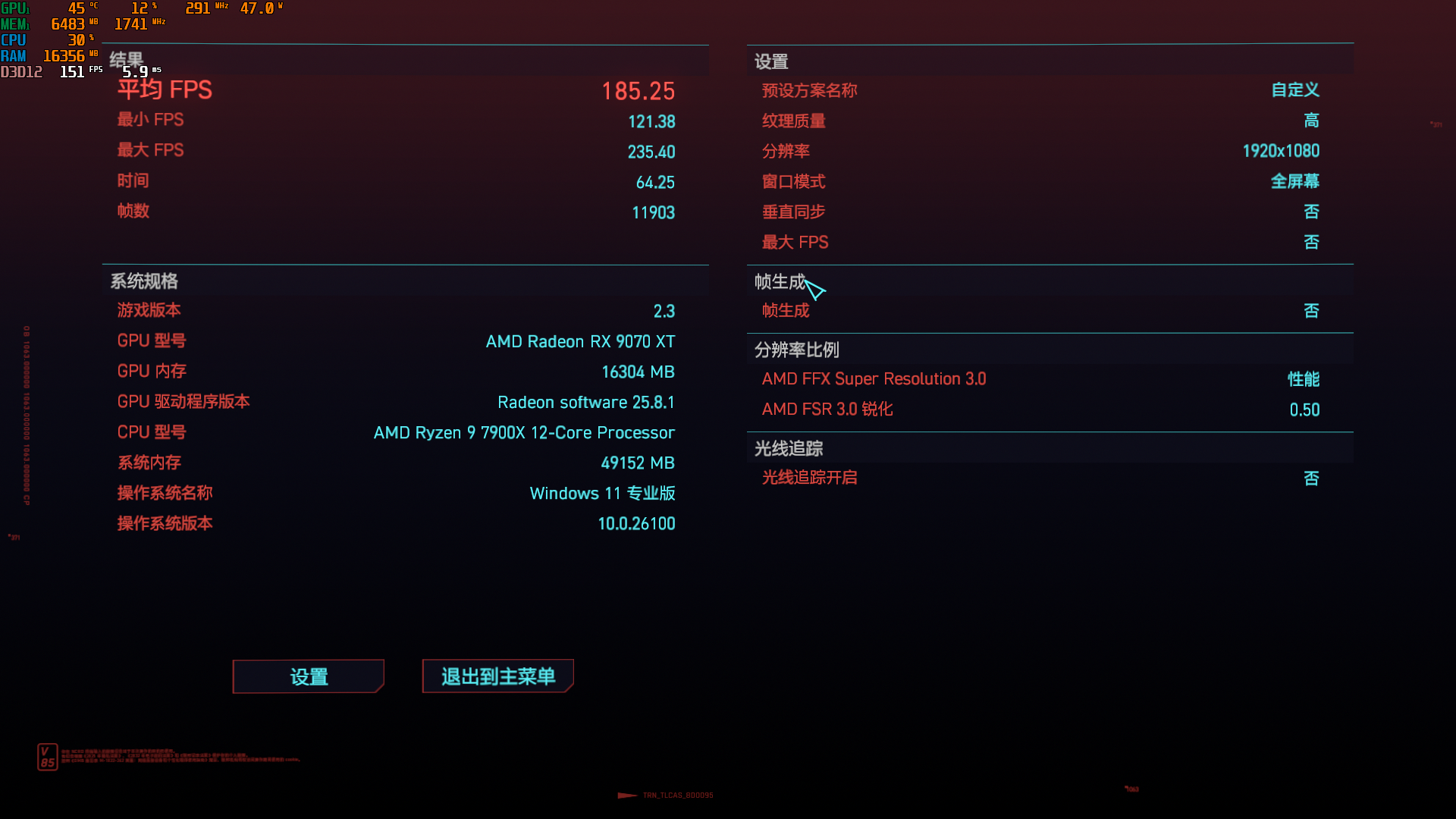在赛博朋克2077中,我画质开到了超级,用了一下FSR3.0,打开到性能,平均帧186.5 帧, 1% low 94.7 帧。