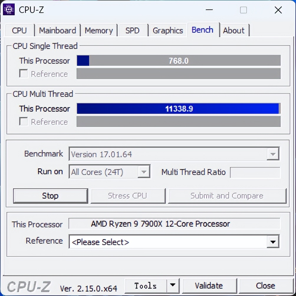 调好BIOS之后我们先看看CPU-Z,参数上没什么问题,这里我用上了上一代的7900X,12核24线程,TDP170W。